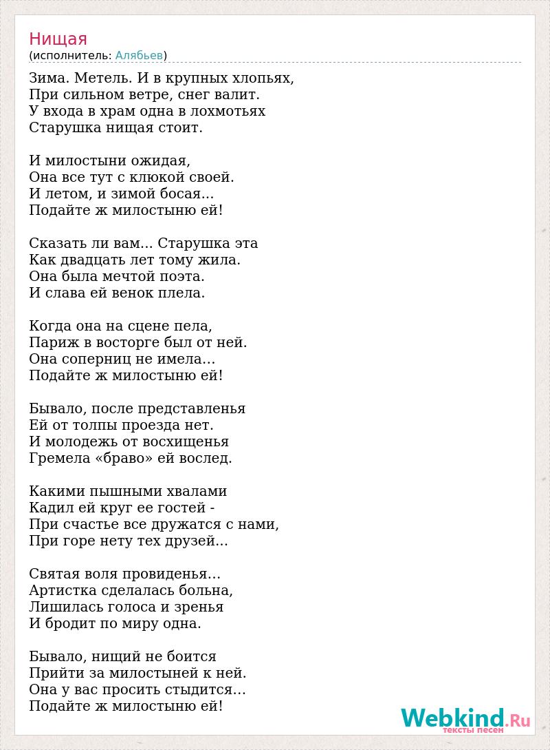 Зима. Метель. И в крупных хлопьях, При сильном ветре, снег валит. У входа в храм одна в лохмотьях Старушка нищая стоит. И милостыни ожидая, Она все тут с клюкой своей. И летом, и зимой босая... Подайте ж милостыню ей! Сказать ли вам... Старушка эта Как двадцать лет тому жила. Она была мечтой поэта. И слава ей венок плела. Когда она на сцене пела, Париж в восторге был от ней. Она соперниц не имела… Подайте ж милостыню ей! Бывало, после представленья Ей от толпы проезда нет. И молодежь от восхищенья Гремела «браво» ей вослед. Какими пышными хвалами Кадил ей круг ее гостей - При счастье все дружатся с нами, При горе нету тех друзей... Святая воля провиденья… Артистка сделалась больна, Лишилась голоса и зренья И бродит по миру одна. Бывало, нищий не боится Прийти за милостыней к ней. Она у вас просить стыдится… Подайте ж милостыню ей!