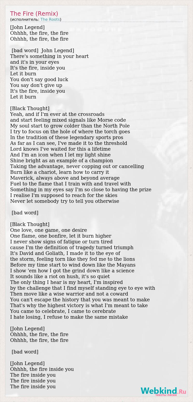 [John Legend] Ohhhh, the fire, the fire Ohhhh, the fire, the fire [bad word] John Legend] There's something in your heart and it's in your eyes It's the fire, inside you Let it burn You don't say good luck You say don't give up It's the fire, inside you Let it burn [Black Thought] Yeah, and if I'm ever at the crossroads and start feeling mixed signals like Morse code My soul start to grow colder than the North Pole I try to focus on the hole of where the torch goes In the tradition of these legendary sports pros As far as I can see, I've made it to the threshold Lord knows I've waited for this a lifetime And I'm an icon when I let my light shine Shine bright as an example of a champion Taking the advantage, never copping out or cancelling Burn like a chariot, learn how to carry it Maverick, always above and beyond average Fuel to the flame that I train with and travel with Something in my eyes say I'm so close to having the prize I realise I'm supposed to reach for the skies Never let somebody try to tell you otherwise [bad word] [Black Thought] One love, one game, one desire One flame, one bonfire, let it burn higher I never show signs of fatigue or turn tired cause I'm the definition of tragedy turned triumph It's David and Goliath, I made it to the eye of the storm, feeling torn like they fed me to the lions Before my time start to wind down like the Mayans I show 'em how I got the grind down like a science It sounds like a riot on hush, it's so quiet The only thing I hear is my heart, I'm inspired by the challenge that I find myself standing eye to eye with Then move like a wise warrior and not a coward You can't escape the history that you was meant to make That's why the highest victory is what I'm meant to take You came to celebrate, I came to cerebrate I hate losing, I refuse to make the same mistake [John Legend] Ohhhh, the fire, the fire Ohhhh, the fire, the fire [bad word] [John Legend] Ohhhh, the fire inside you The fire inside you The fire inside you The fire inside you