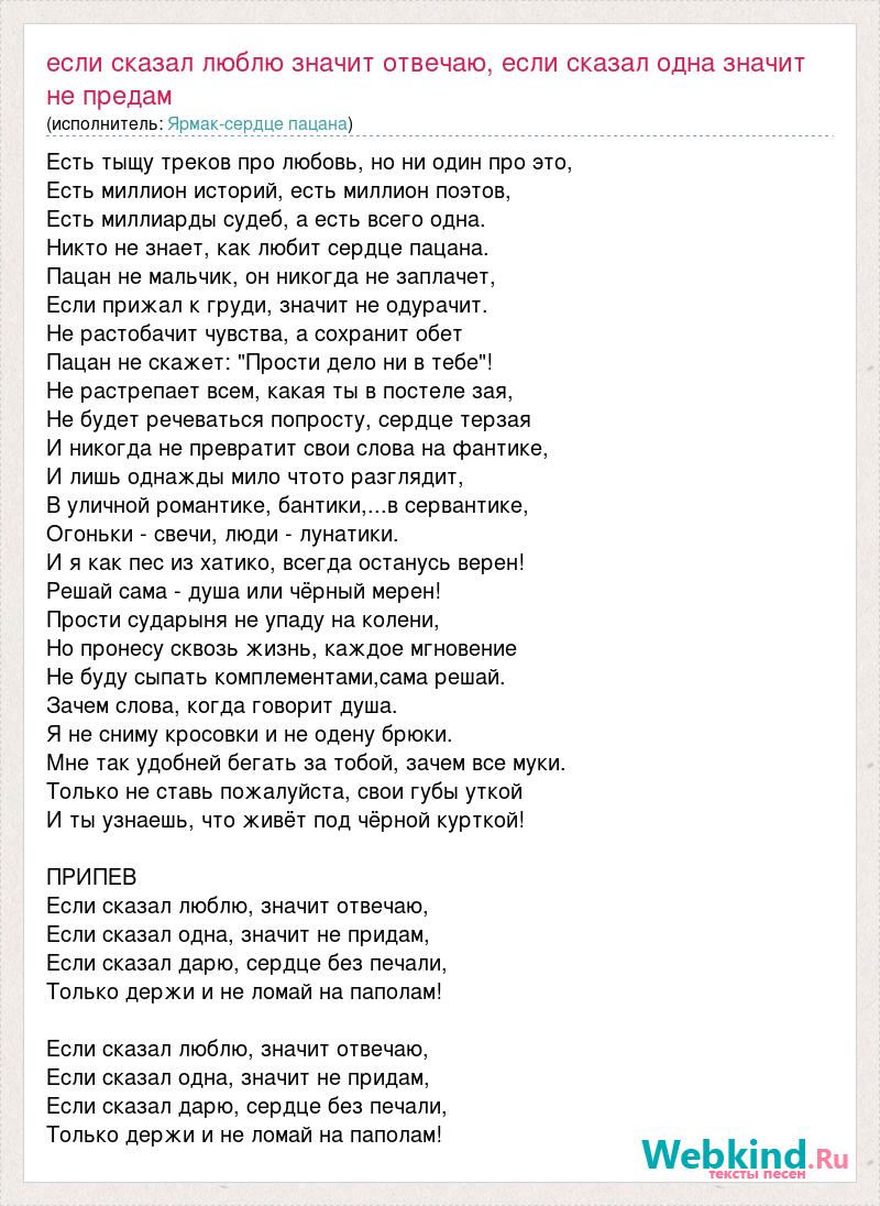 Есть тыщу треков про любовь, но ни один про это, Есть миллион историй, есть миллион поэтов, Есть миллиарды судеб, а есть всего одна. Никто не знает, как любит сердце пацана. Пацан не мальчик, он никогда не заплачет, Если прижал к груди, значит не одурачит. Не растобачит чувства, а сохранит обет Пацан не скажет: "Прости дело ни в тебе"! Не растрепает всем, какая ты в постеле зая, Не будет речеваться попросту, сердце терзая И никогда не превратит свои слова на фантике, И лишь однажды мило чтото разглядит, В уличной романтике, бантики,...в сервантике, Огоньки - свечи, люди - лунатики. И я как пес из хатико, всегда останусь верен! Решай сама - душа или чёрный мерен! Прости сударыня не упаду на колени, Но пронесу сквозь жизнь, каждое мгновение Не буду сыпать комплементами,сама решай. Зачем слова, когда говорит душа. Я не сниму кросовки и не одену брюки. Мне так удобней бегать за тобой, зачем все муки. Только не ставь пожалуйста, свои губы уткой И ты узнаешь, что живёт под чёрной курткой! ПРИПЕВ Если сказал люблю, значит отвечаю, Если сказал одна, значит не придам, Если сказал дарю, сердце без печали, Только держи и не ломай на паполам! Если сказал люблю, значит отвечаю, Если сказал одна, значит не придам, Если сказал дарю, сердце без печали, Только держи и не ломай на паполам!