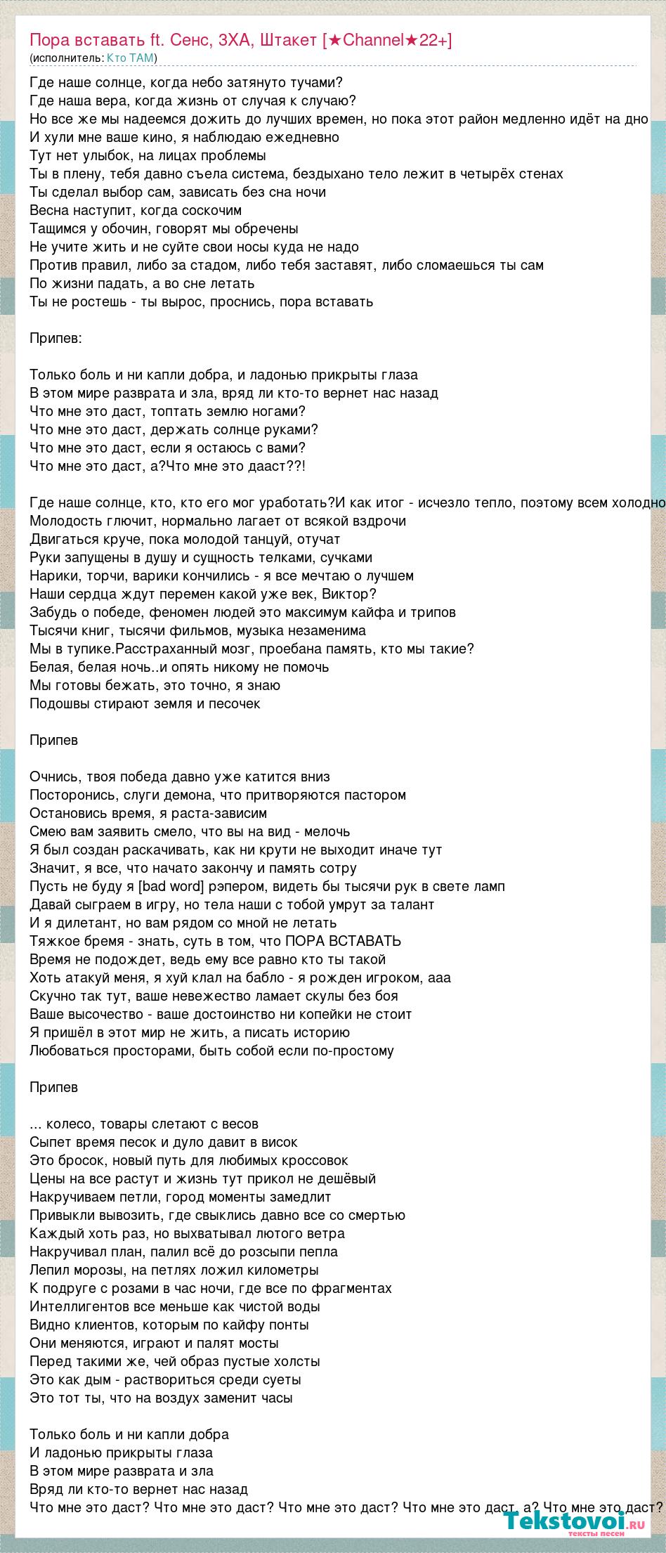Где наше солнце, когда небо затянуто тучами? Где наша вера, когда жизнь от случая к случаю? Но все же мы надеемся дожить до лучших времен, но пока этот район медленно идёт на дно И хули мне ваше кино, я наблюдаю ежедневно Тут нет улыбок, на лицах проблемы Ты в плену, тебя давно съела система, бездыхано тело лежит в четырёх стенах Ты сделал выбор сам, зависать без сна ночи Весна наступит, когда соскочим Тащимся у обочин, говорят мы обречены Не учите жить и не суйте свои носы куда не надо Против правил, либо за стадом, либо тебя заставят, либо сломаешься ты сам По жизни падать, а во сне летать Ты не ростешь - ты вырос, проснись, пора вставать Припев: Только боль и ни капли добра, и ладонью прикрыты глаза В этом мире разврата и зла, вряд ли кто-то вернет нас назад Что мне это даст, топтать землю ногами? Что мне это даст, держать солнце руками? Что мне это даст, если я остаюсь с вами? Что мне это даст, а?Что мне это дааст??! Где наше солнце, кто, кто его мог уработать?И как итог - исчезло тепло, поэтому всем холодно Молодость глючит, нормально лагает от всякой вздрочи Двигаться круче, пока молодой танцуй, отучат Руки запущены в душу и сущность телками, сучками Нарики, торчи, варики кончились - я все мечтаю о лучшем Наши сердца ждут перемен какой уже век, Виктор? Забудь о победе, феномен людей это максимум кайфа и трипов Тысячи книг, тысячи фильмов, музыка незаменима Мы в тупике.Расстраханный мозг, проебана память, кто мы такие? Белая, белая ночь..и опять никому не помочь Мы готовы бежать, это точно, я знаю Подошвы стирают земля и песочек Припев Очнись, твоя победа давно уже катится вниз Посторонись, слуги демона, что притворяются пастором Остановись время, я раста-зависим Смею вам заявить смело, что вы на вид - мелочь Я был создан раскачивать, как ни крути не выходит иначе тут Значит, я все, что начато закончу и память сотру Пусть не буду я [bad word] рэпером, видеть бы тысячи рук в свете ламп Давай сыграем в игру, но тела наши с тобой умрут за талант И я дилетант, но вам рядом со мной не летать Тяжкое бремя - знать, суть в том, что ПОРА ВСТАВАТЬ Время не подождет, ведь ему все равно кто ты такой Хоть атакуй меня, я хуй клал на бабло - я рожден игроком, ааа Скучно так тут, ваше невежество ламает скулы без боя Ваше высочество - ваше достоинство ни копейки не стоит Я пришёл в этот мир не жить, а писать историю Любоваться просторами, быть собой если по-простому Припев ... колесо, товары слетают с весов Сыпет время песок и дуло давит в висок Это бросок, новый путь для любимых кроссовок Цены на все растут и жизнь тут прикол не дешёвый Накручиваем петли, город моменты замедлит Привыкли вывозить, где свыклись давно все со смертью Каждый хоть раз, но выхватывал лютого ветра Накручивал план, палил всё до розсыпи пепла Лепил морозы, на петлях ложил километры К подруге с розами в час ночи, где все по фрагментах Интеллигентов все меньше как чистой воды Видно клиентов, которым по кайфу понты Они меняются, играют и палят мосты Перед такими же, чей образ пустые холсты Это как дым - раствориться среди суеты Это тот ты, что на воздух заменит часы Только боль и ни капли добра И ладонью прикрыты глаза В этом мире разврата и зла Вряд ли кто-то вернет нас назад Что мне это даст? Что мне это даст? Что мне это даст? Что мне это даст, а? Что мне это даст?