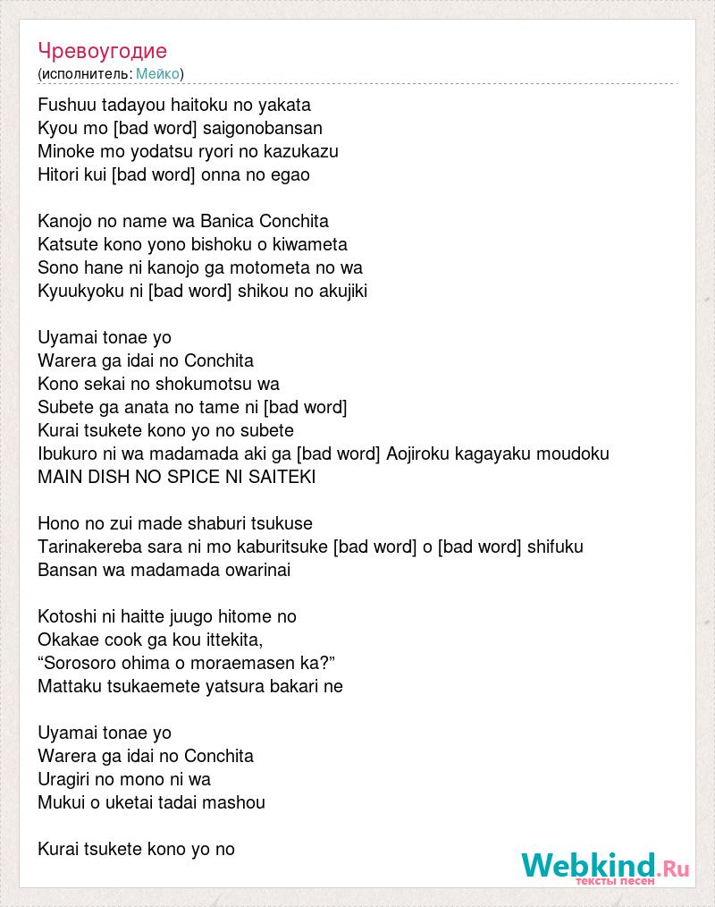 Fushuu tadayou haitoku no yakata Kyou mo [bad word] saigonobansan Minoke mo yodatsu ryori no kazukazu Hitori kui [bad word] onna no egao Kanojo no name wa Banica Conchita Katsute kono yono bishoku o kiwameta Sono hane ni kanojo ga motometa no wa Kyuukyoku ni [bad word] shikou no akujiki Uyamai tonae yo Warera ga idai no Conchita Kono sekai no shokumotsu wa Subete ga anata no tame ni [bad word] Kurai tsukete kono yo no subete Ibukuro ni wa madamada aki ga [bad word] Aojiroku kagayaku moudoku MAIN DISH NO SPICE NI SAITEKI Hono no zui made shaburi tsukuse Tarinakereba sara ni mo kaburitsuke [bad word] o [bad word] shifuku Bansan wa madamada owarinai Kotoshi ni haitte juugo hitome no Okakae cook ga kou ittekita, “Sorosoro ohima o moraemasen ka?” Mattaku tsukaemete yatsura bakari ne Uyamai tonae yo Warera ga idai no Conchita Uragiri no mono ni wa Mukui o uketai tadai mashou Kurai tsukete kono yo no