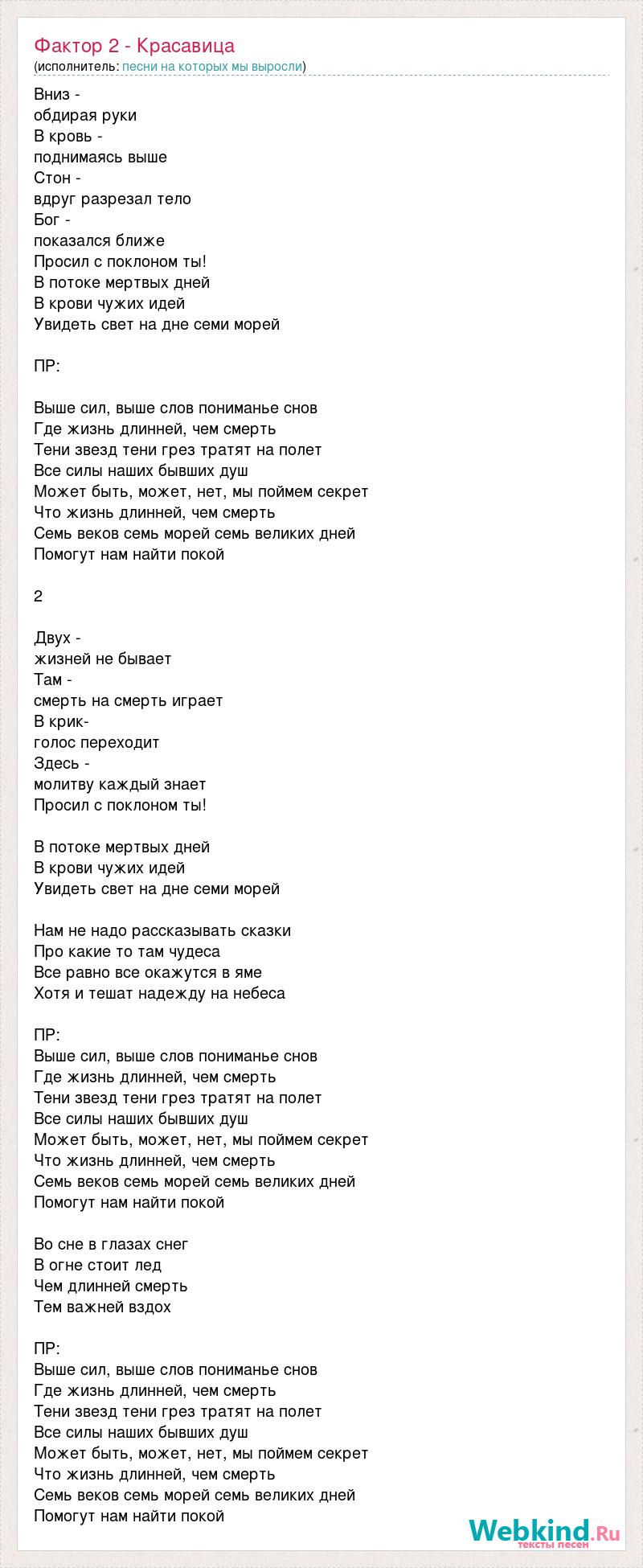Вниз - обдирая руки В кровь - поднимаясь выше Стон - вдруг разрезал тело Бог - показался ближе Просил с поклоном ты! В потоке мертвых дней В крови чужих идей Увидеть свет на дне семи морей ПР: Выше сил, выше слов пониманье снов Где жизнь длинней, чем смерть Тени звезд тени грез тратят на полет Все силы наших бывших душ Может быть, может, нет, мы поймем секрет Что жизнь длинней, чем смерть Семь веков семь морей семь великих дней Помогут нам найти покой 2 Двух - жизней не бывает Там - смерть на смерть играет В крик- голос переходит Здесь - молитву каждый знает Просил с поклоном ты! В потоке мертвых дней В крови чужих идей Увидеть свет на дне семи морей Нам не надо рассказывать сказки Про какие то там чудеса Все равно все окажутся в яме Хотя и тешат надежду на небеса ПР: Выше сил, выше слов пониманье снов Где жизнь длинней, чем смерть Тени звезд тени грез тратят на полет Все силы наших бывших душ Может быть, может, нет, мы поймем секрет Что жизнь длинней, чем смерть Семь веков семь морей семь великих дней Помогут нам найти покой Во сне в глазах снег В огне стоит лед Чем длинней смерть Тем важней вздох ПР: Выше сил, выше слов пониманье снов Где жизнь длинней, чем смерть Тени звезд тени грез тратят на полет Все силы наших бывших душ Может быть, может, нет, мы поймем секрет Что жизнь длинней, чем смерть Семь веков семь морей семь великих дней Помогут нам найти покой