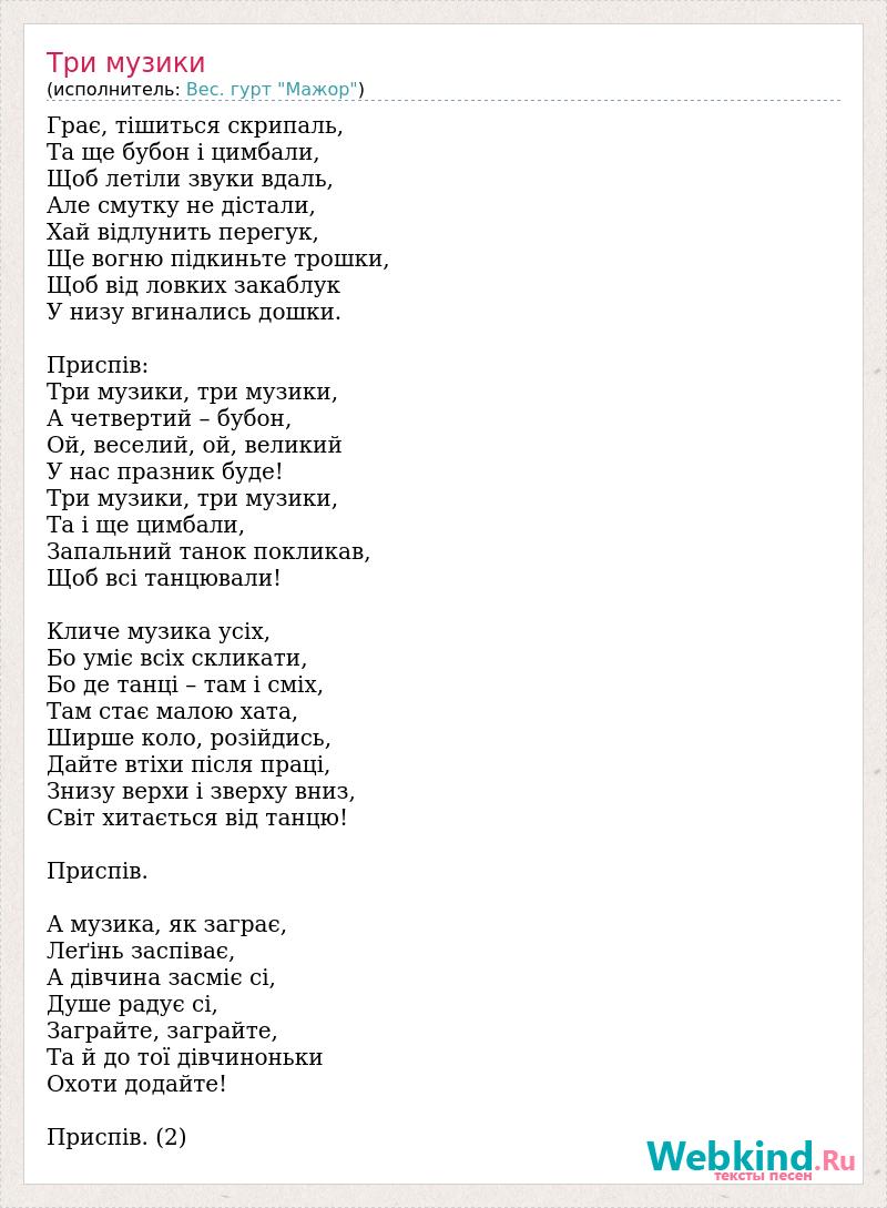Грає, тішиться скрипаль, Та ще бубон і цимбали, Щоб летіли звуки вдаль, Але смутку не дістали, Хай відлунить перегук, Ще вогню підкиньте трошки, Щоб від ловких закаблук У низу вгинались дошки. Приспів: Три музики, три музики, А четвертий – бубон, Ой, веселий, ой, великий У нас празник буде! Три музики, три музики, Та і ще цимбали, Запальний танок покликав, Щоб всі танцювали! Кличе музика усіх, Бо уміє всіх скликати, Бо де танці – там і сміх, Там стає малою хата, Ширше коло, розійдись, Дайте втіхи після праці, Знизу верхи і зверху вниз, Світ хитається від танцю! Приспів. А музика, як заграє, Леґінь заспіває, А дівчина засміє сі, Душе радує сі, Заграйте, заграйте, Та й до тої дівчиноньки Охоти додайте! Приспів. (2)