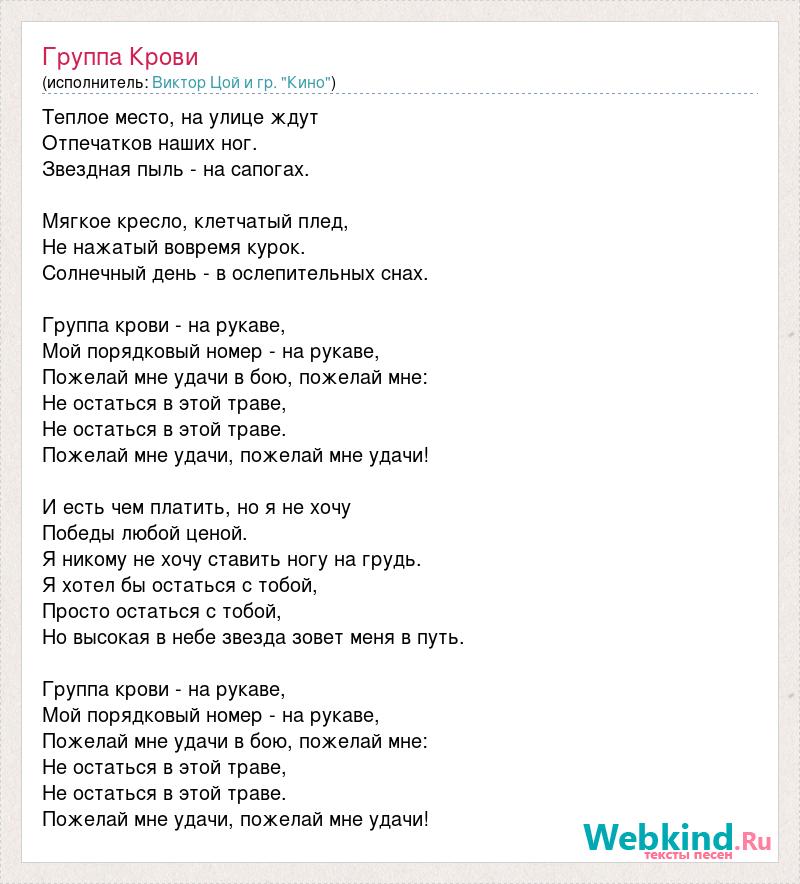 Теплое место, на улице ждут Отпечатков наших ног. Звездная пыль - на сапогах. Мягкое кресло, клетчатый плед, Не нажатый вовремя курок. Солнечный день - в ослепительных снах. Группа крови - на рукаве, Мой порядковый номер - на рукаве, Пожелай мне удачи в бою, пожелай мне: Не остаться в этой траве, Не остаться в этой траве. Пожелай мне удачи, пожелай мне удачи! И есть чем платить, но я не хочу Победы любой ценой. Я никому не хочу ставить ногу на грудь. Я хотел бы остаться с тобой, Просто остаться с тобой, Но высокая в небе звезда зовет меня в путь. Группа крови - на рукаве, Мой порядковый номер - на рукаве, Пожелай мне удачи в бою, пожелай мне: Не остаться в этой траве, Не остаться в этой траве. Пожелай мне удачи, пожелай мне удачи!