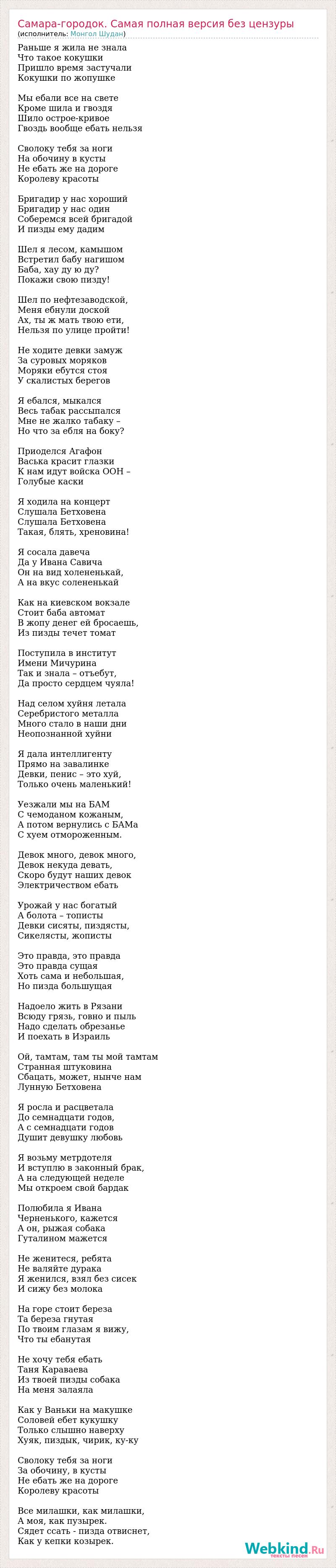 Раньше я жила не знала Что такое кокушки Пришло время застучали Кокушки по жопушке Мы ебали все на свете Кроме шила и гвоздя Шило острое-кривое Гвоздь вообще ебать нельзя Сволоку тебя за ноги На обочину в кусты Не ебать же на дороге Королеву красоты Бригадир у нас хороший Бригадир у нас один Соберемся всей бригадой И пизды ему дадим Шел я лесом, камышом Встретил бабу нагишом Баба, хау ду ю ду? Покажи свою пизду! Шел по нефтезаводской, Меня ебнули доской Ах, ты ж мать твою ети, Нельзя по улице пройти! Не ходите девки замуж За суровых моряков Моряки ебутся стоя У скалистых берегов Я ебался, мыкался Весь табак рассыпался Мне не жалко табаку – Но что за ебля на боку? Приоделся Агафон Васька красит глазки К нам идут войска ООН – Голубые каски Я ходила на концерт Слушала Бетховена Слушала Бетховена Такая, блять, хреновина! Я сосала давеча Да у Ивана Савича Он на вид холененькай, А на вкус солененькай Как на киевском вокзале Стоит баба автомат В жопу денег ей бросаешь, Из пизды течет томат Поступила в институт Имени Мичурина Так и знала – отъебут, Да просто сердцем чуяла! Над селом хуйня летала Серебристого металла Много стало в наши дни Неопознанной хуйни Я дала интеллигенту Прямо на завалинке Девки, пенис – это хуй, Только очень маленький! Уезжали мы на БАМ С чемоданом кожаным, А потом вернулись с БАМа С хуем отмороженным. Девок много, девок много, Девок некуда девать, Скоро будут наших девок Электричеством ебать Урожай у нас богатый А болота – тописты Девки сисяты, пиздясты, Сикелясты, жописты Это правда, это правда Это правда сущая Хоть сама и небольшая, Но пизда большущая Надоело жить в Рязани Всюду грязь, говно и пыль Надо сделать обрезанье И поехать в Израиль Ой, тамтам, там ты мой тамтам Странная штуковина Сбацать, может, нынче нам Лунную Бетховена Я росла и расцветала До семнадцати годов, А с семнадцати годов Душит девушку любовь Я возьму метрдотеля И вступлю в законный брак, А на следующей неделе Мы откроем свой бардак Полюбила я Ивана Черненького, кажется А он, рыжая собака Гуталином мажется Не женитеся, ребята Не валяйте дурака Я женился, взял без сисек И сижу без молока На горе стоит береза Та береза гнутая По твоим глазам я вижу, Что ты ебанутая Не хочу тебя ебать Таня Караваева Из твоей пизды собака На меня залаяла Как у Ваньки на макушке Соловей ебет кукушку Только слышно наверху Хуяк, пиздык, чирик, ку-ку Сволоку тебя за ноги За обочину, в кусты Не ебать же на дороге Королеву красоты Все милашки, как милашки, А моя, как пузырек. Сядет ссать - пизда отвиснет, Как у кепки козырек.