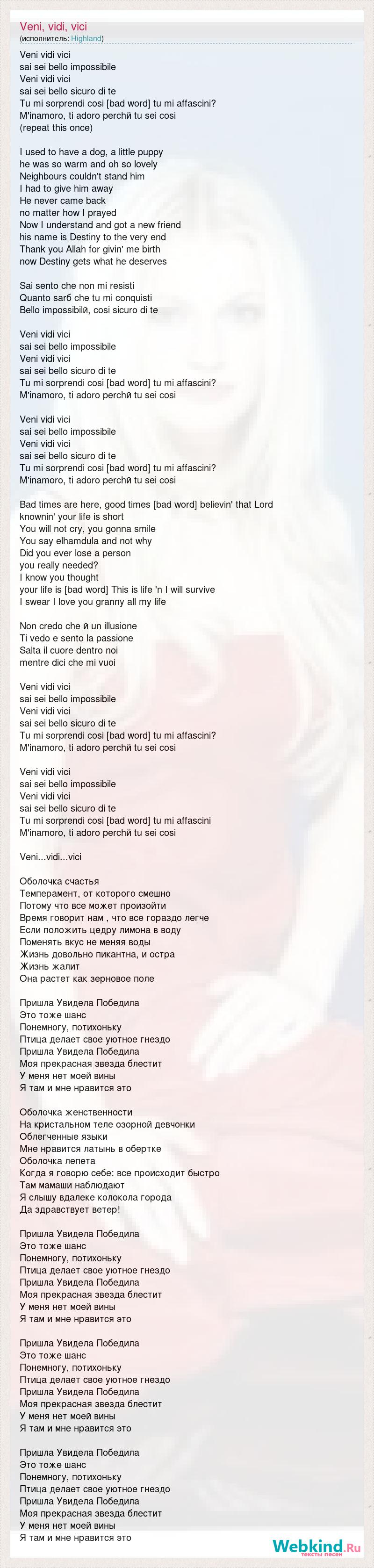 Veni vidi vici sai sei bello impossibile Veni vidi vici sai sei bello sicuro di te Tu mi sorprendi cosi [bad word] tu mi affascini? M'inamoro, ti adoro perchй tu sei cosi (repeat this once) I used to have a dog, a little puppy he was so warm and oh so lovely Neighbours couldn't stand him I had to give him away He never came back no matter how I prayed Now I understand and got a new friend his name is Destiny to the very end Thank you Allah for givin' me birth now Destiny gets what he deserves Sai sento che non mi resisti Quanto sarб che tu mi conquisti Bello impossibilй, cosi sicuro di te Veni vidi vici sai sei bello impossibile Veni vidi vici sai sei bello sicuro di te Tu mi sorprendi cosi [bad word] tu mi affascini? M'inamoro, ti adoro perchй tu sei cosi Veni vidi vici sai sei bello impossibile Veni vidi vici sai sei bello sicuro di te Tu mi sorprendi cosi [bad word] tu mi affascini? M'inamoro, ti adoro perchй tu sei cosi Bad times are here, good times [bad word] believin' that Lord knownin' your life is short You will not cry, you gonna smile You say elhamdula and not why Did you ever lose a person you really needed? I know you thought your life is [bad word] This is life 'n I will survive I swear I love you granny all my life Non credo che й un illusione Ti vedo e sento la passione Salta il cuore dentro noi mentre dici che mi vuoi Veni vidi vici sai sei bello impossibile Veni vidi vici sai sei bello sicuro di te Tu mi sorprendi cosi [bad word] tu mi affascini? M'inamoro, ti adoro perchй tu sei cosi Veni vidi vici sai sei bello impossibile Veni vidi vici sai sei bello sicuro di te Tu mi sorprendi cosi [bad word] tu mi affascini M'inamoro, ti adoro perchй tu sei cosi Veni...vidi...vici Оболочка счастья Темперамент, от которого смешно Потому что все может произойти Время говорит нам , что все гораздо легче Если положить цедру лимона в воду Поменять вкус не меняя воды Жизнь довольно пикантна, и остра Жизнь жалит Она растет как зерновое поле Пришла Увидела Победила Это тоже шанс Понемногу, потихоньку Птица делает свое уютное гнездо Пришла Увидела Победила Моя прекрасная звезда блестит У меня нет моей вины Я там и мне нравится это Оболочка женственности На кристальном теле озорной девчонки Облегченные языки Мне нравится латынь в обертке Оболочка лепета Когда я говорю себе: все происходит быстро Там мамаши наблюдают Я слышу вдалеке колокола города Да здравствует ветер! Пришла Увидела Победила Это тоже шанс Понемногу, потихоньку Птица делает свое уютное гнездо Пришла Увидела Победила Моя прекрасная звезда блестит У меня нет моей вины Я там и мне нравится это Пришла Увидела Победила Это тоже шанс Понемногу, потихоньку Птица делает свое уютное гнездо Пришла Увидела Победила Моя прекрасная звезда блестит У меня нет моей вины Я там и мне нравится это Пришла Увидела Победила Это тоже шанс Понемногу, потихоньку Птица делает свое уютное гнездо Пришла Увидела Победила Моя прекрасная звезда блестит У меня нет моей вины Я там и мне нравится это