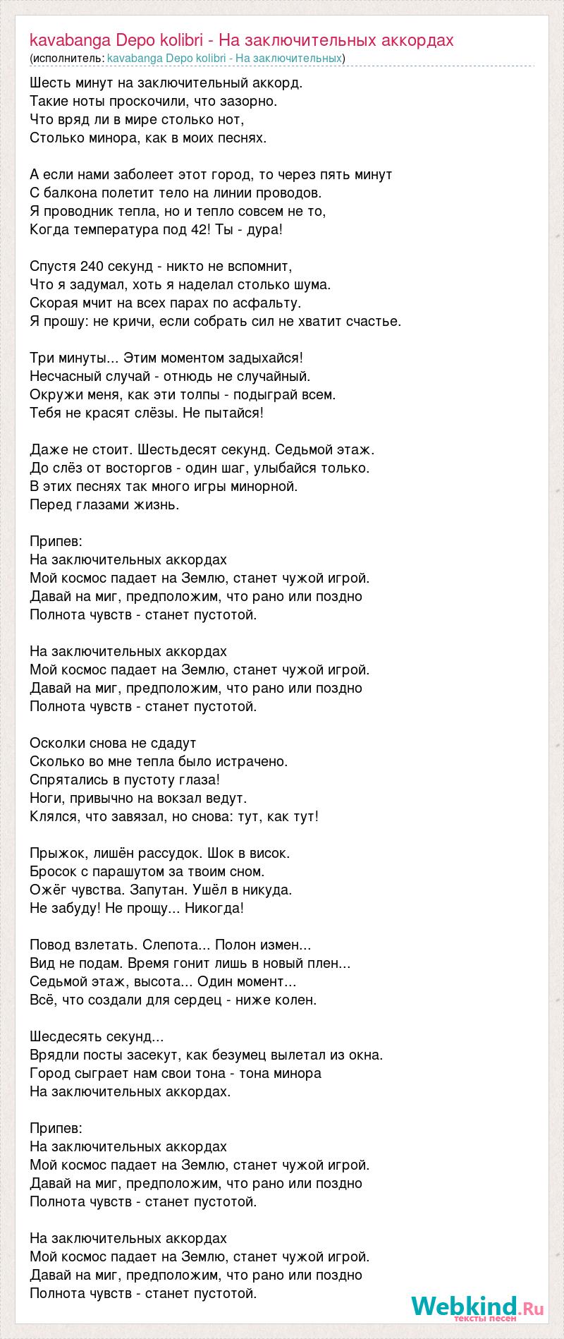 Шесть минут на заключительный аккорд. Такие ноты проскочили, что зазорно. Что вряд ли в мире столько нот, Столько минора, как в моих песнях. А если нами заболеет этот город, то через пять минут С балкона полетит тело на линии проводов. Я проводник тепла, но и тепло совсем не то, Когда температура под 42! Ты - дура! Спустя 240 секунд - никто не вспомнит, Что я задумал, хоть я наделал столько шума. Скорая мчит на всех парах по асфальту. Я прошу: не кричи, если собрать сил не хватит счастье. Три минуты... Этим моментом задыхайся! Несчасный случай - отнюдь не случайный. Окружи меня, как эти толпы - подыграй всем. Тебя не красят слёзы. Не пытайся! Даже не стоит. Шестьдесят секунд. Седьмой этаж. До слёз от восторгов - один шаг, улыбайся только. В этих песнях так много игры минорной. Перед глазами жизнь. Припев: На заключительных аккордах Мой космос падает на Землю, станет чужой игрой. Давай на миг, предположим, что рано или поздно Полнота чувств - станет пустотой. На заключительных аккордах Мой космос падает на Землю, станет чужой игрой. Давай на миг, предположим, что рано или поздно Полнота чувств - станет пустотой. Осколки снова не сдадут Сколько во мне тепла было истрачено. Спрятались в пустоту глаза! Ноги, привычно на вокзал ведут. Клялся, что завязал, но снова: тут, как тут! Прыжок, лишён рассудок. Шок в висок. Бросок с парашутом за твоим сном. Ожёг чувства. Запутан. Ушёл в никуда. Не забуду! Не прощу... Никогда! Повод взлетать. Слепота... Полон измен... Вид не подам. Время гонит лишь в новый плен... Седьмой этаж, высота... Один момент... Всё, что создали для сердец - ниже колен. Шесдесять секунд... Врядли посты засекут, как безумец вылетал из окна. Город сыграет нам свои тона - тона минора На заключительных аккордах. Припев: На заключительных аккордах Мой космос падает на Землю, станет чужой игрой. Давай на миг, предположим, что рано или поздно Полнота чувств - станет пустотой. На заключительных аккордах Мой космос падает на Землю, станет чужой игрой. Давай на миг, предположим, что рано или поздно Полнота чувств - станет пустотой.