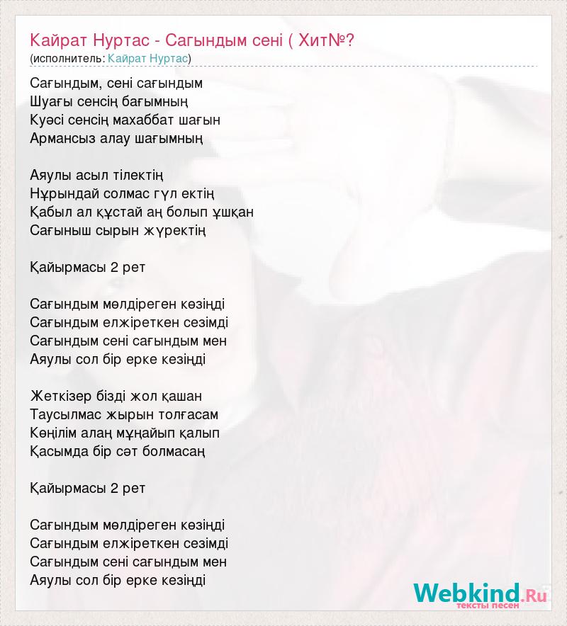 Сағындым, сені сағындым Шуағы сенсің бағымның Куәсі сенсің махаббат шағын Армансыз алау шағымның Аяулы асыл тілектің Нұрындай солмас гүл ектің Қабыл ал құстай аң болып ұшқан Сағыныш сырын жүректің Қайырмасы 2 рет Сағындым мөлдіреген көзіңді Сағындым елжіреткен сезімді Сағындым сені сағындым мен Аяулы сол бір ерке кезіңді Жеткізер бізді жол қашан Таусылмас жырын толғасам Көңілім алаң мұңайып қалып Қасымда бір сәт болмасаң Қайырмасы 2 рет Сағындым мөлдіреген көзіңді Сағындым елжіреткен сезімді Сағындым сені сағындым мен Аяулы сол бір ерке кезіңді