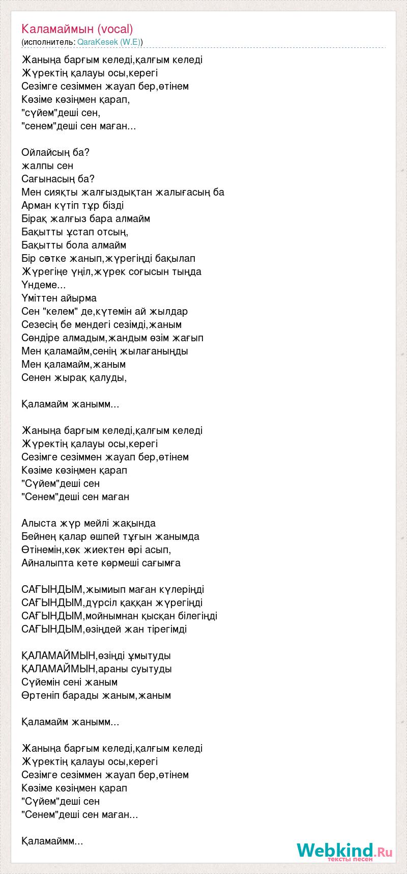 Жаныңа барғым келеді,қалғым келеді Жүректің қалауы осы,керегі Сезімге сезіммен жауап бер,өтінем Көзіме көзіңмен қарап, "сүйем"деші сен, "сенем"деші сен маған... Ойлайсың ба? жалпы сен Сағынасың ба? Мен сияқты жалғыздықтан жалығасың ба Арман күтіп тұр бізді Бірақ жалғыз бара алмайм Бақытты ұстап отсың, Бақытты бола алмайм Бір сəтке жанып,жүрегіңді бақылап Жүрегіңе үңіл,жүрек соғысын тыңда Үндеме... Үміттен айырма Сен "келем" де,күтемін ай жылдар Сезесің бе мендегі сезімді,жаным Сөндіре алмадым,жандым өзім жағып Мен қаламайм,сенің жылағаныңды Мен қаламайм,жаным Сенен жырақ қалуды, Қаламайм жанымм... Жаныңа барғым келеді,қалғым келеді Жүректің қалауы осы,керегі Сезімге сезіммен жауап бер,өтінем Көзіме көзіңмен қарап "Сүйем"деші сен "Сенем"деші сен маған Алыста жүр мейлі жақында Бейнең қалар өшпей тұғын жанымда Өтінемін,көк жиектен əрі асып, Айналыпта кете көрмеші сағымға САҒЫНДЫМ,жымиып маған күлеріңді САҒЫНДЫМ,дүрсіл қаққан жүрегіңді САҒЫНДЫМ,мойнымнан қысқан білегіңді САҒЫНДЫМ,өзіңдей жан тірегімді ҚАЛАМАЙМЫН,өзіңді ұмытуды ҚАЛАМАЙМЫН,араны суытуды Сүйемін сені жаным Өртеніп барады жаным,жаным Қаламайм жанымм... Жаныңа барғым келеді,қалғым келеді Жүректің қалауы осы,керегі Сезімге сезіммен жауап бер,өтінем Көзіме көзіңмен қарап "Сүйем"деші сен "Сенем"деші сен маған... Қаламаймм...