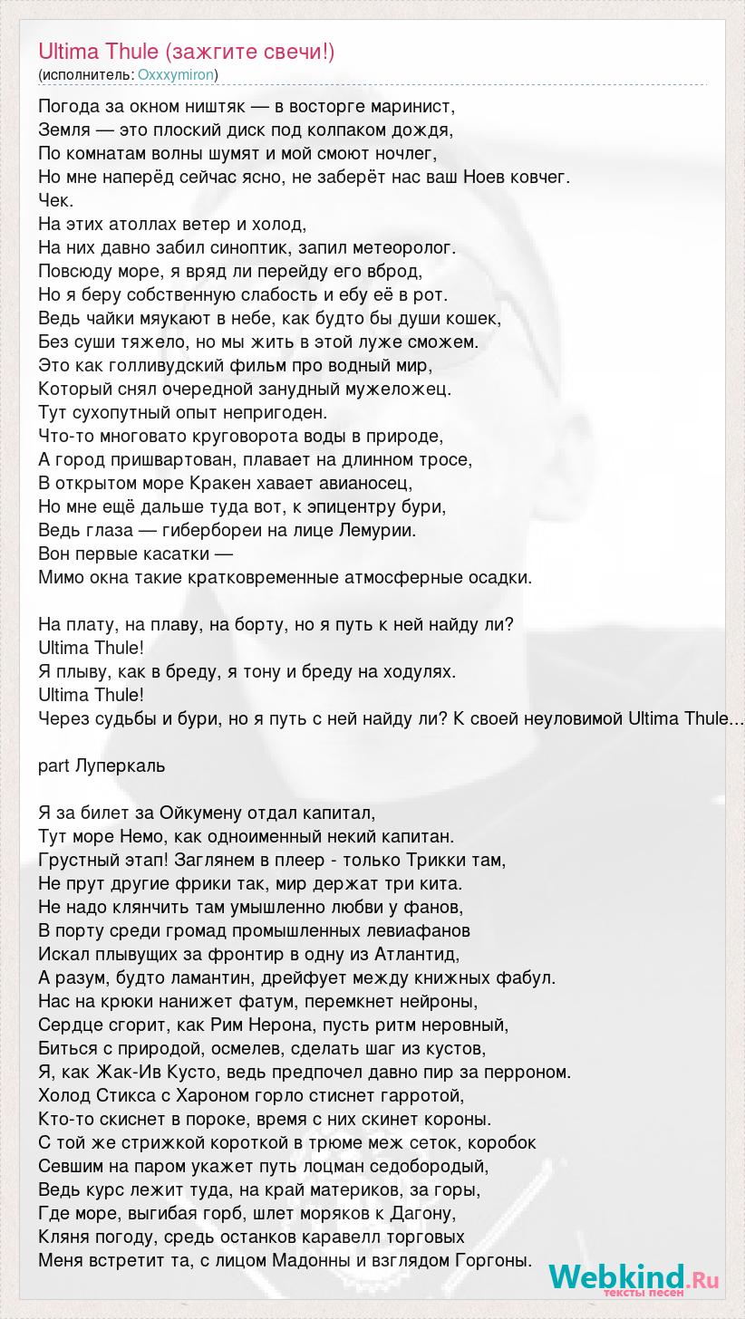 Погода за окном ништяк — в восторге маринист, Земля — это плоский диск под колпаком дождя, По комнатам волны шумят и мой смоют ночлег, Но мне наперёд сейчас ясно, не заберёт нас ваш Ноев ковчег. Чек. На этих атоллах ветер и холод, На них давно забил синоптик, запил метеоролог. Повсюду море, я вряд ли перейду его вброд, Но я беру собственную слабость и ебу её в рот. Ведь чайки мяукают в небе, как будто бы души кошек, Без суши тяжело, но мы жить в этой луже сможем. Это как голливудский фильм про водный мир, Который снял очередной занудный мужеложец. Тут сухопутный опыт непригоден. Что-то многовато круговорота воды в природе, А город пришвартован, плавает на длинном тросе, В открытом море Кракен хавает авианосец, Но мне ещё дальше туда вот, к эпицентру бури, Ведь глаза — гибербореи на лице Лемурии. Вон первые касатки — Мимо окна такие кратковременные атмосферные осадки. На плату, на плаву, на борту, но я путь к ней найду ли? Ultima Thule! Я плыву, как в бреду, я тону и бреду на ходулях. Ultima Thule! Через судьбы и бури, но я путь с ней найду ли? К своей неуловимой Ultima Thule... part Луперкаль Я за билет за Ойкумену отдал капитал, Тут море Немо, как одноименный некий капитан. Грустный этап! Заглянем в плеер - только Трикки там, Не прут другие фрики так, мир держат три кита. Не надо клянчить там умышленно любви у фанов, В порту среди громад промышленных левиафанов Искал плывущих за фронтир в одну из Атлантид, А разум, будто ламантин, дрейфует между книжных фабул. Нас на крюки нанижет фатум, перемкнет нейроны, Сердце сгорит, как Рим Нерона, пусть ритм неровный, Биться с природой, осмелев, сделать шаг из кустов, Я, как Жак-Ив Кусто, ведь предпочел давно пир за перроном. Холод Стикса с Хароном горло стиснет гарротой, Кто-то скиснет в пороке, время с них скинет короны. С той же стрижкой короткой в трюме меж сеток, коробок Севшим на паром укажет путь лоцман седобородый, Ведь курс лежит туда, на край материков, за горы, Где море, выгибая горб, шлет моряков к Дагону, Кляня погоду, средь останков каравелл торговых Меня встретит та, с лицом Мадонны и взглядом Горгоны.