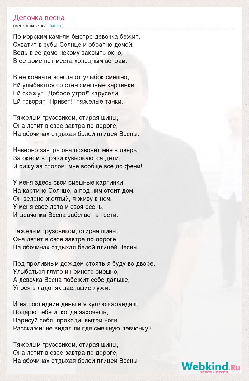 По морским камням быстро девочка бежит, Схватит в зубы Солнце и обратно домой. Ведь в ее доме некому закрыть окно, В ее доме нет места холодным ветрам. В ее комнате всегда от улыбок смешно, Ей улыбаются со стен смешные картинки. Ей скажут "Доброе утро!" карусели. Ей говорят "Привет!" тяжелые танки. Тяжелым грузовиком, стирая шины, Она летит в свое завтра по дороге, На обочинах отдыхая белой птицей Весны. Наверно завтра она позвонит мне в дверь, За окном в грязи кувыркаются дети, Я сижу за столом, мне вообще всё до фени! У меня здесь свои смешные картинки! На картине Солнце, а под ним стоит дом. Он зелено-желтый, я живу в нем. У меня свое лето и своя осень, И девчонка Весна забегает в гости. Тяжелым грузовиком, стирая шины, Она летит в свое завтра по дороге, На обочинах отдыхая белой птицей Весны. Под проливным дождем стоять я буду во дворе, Улыбаться глупо и немного смешно, А девочка Весна побежит себе дальше, Унося в ладонях зае..вшие лужи. И на последние деньги я куплю карандаш, Подарю тебе и, когда захочешь, Нарисуй себя, проходи, вытри ноги. Расскажи: не видал ли где смешную девчонку? Тяжелым грузовиком, стирая шины, Она летит в свое завтра по дороге, На обочинах отдыхая белой птицей Весны