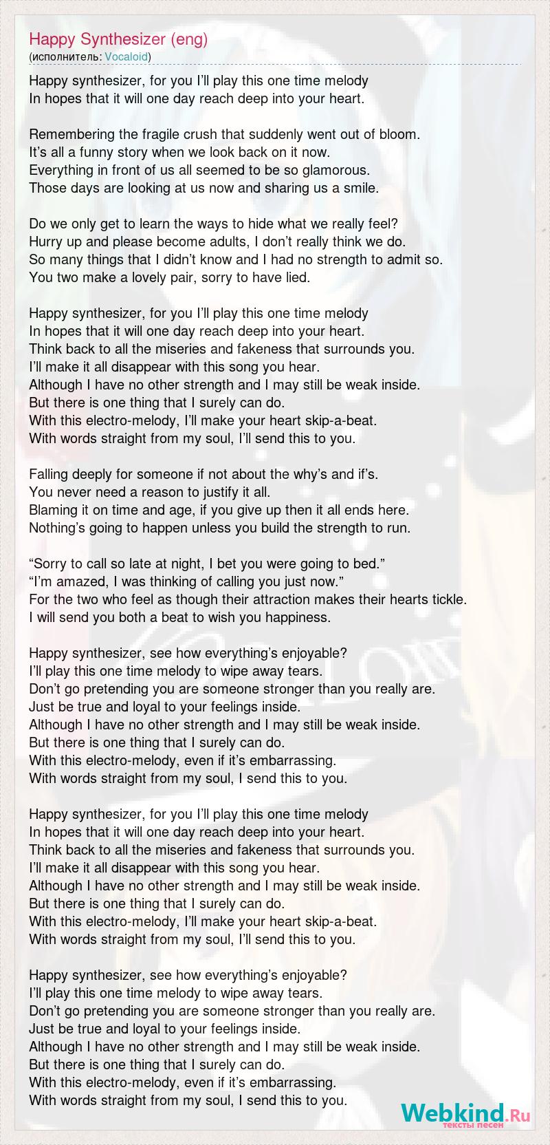 Happy synthesizer, for you I’ll play this one time melody In hopes that it will one day reach deep into your heart. Remembering the fragile crush that suddenly went out of bloom. It’s all a funny story when we look back on it now. Everything in front of us all seemed to be so glamorous. Those days are looking at us now and sharing us a smile. Do we only get to learn the ways to hide what we really feel? Hurry up and please become adults, I don’t really think we do. So many things that I didn’t know and I had no strength to admit so. You two make a lovely pair, sorry to have lied. Happy synthesizer, for you I’ll play this one time melody In hopes that it will one day reach deep into your heart. Think back to all the miseries and fakeness that surrounds you. I’ll make it all disappear with this song you hear. Although I have no other strength and I may still be weak inside. But there is one thing that I surely can do. With this electro-melody, I’ll make your heart skip-a-beat. With words straight from my soul, I’ll send this to you. Falling deeply for someone if not about the why’s and if’s. You never need a reason to justify it all. Blaming it on time and age, if you give up then it all ends here. Nothing’s going to happen unless you build the strength to run. “Sorry to call so late at night, I bet you were going to bed.” “I’m amazed, I was thinking of calling you just now.” For the two who feel as though their attraction makes their hearts tickle. I will send you both a beat to wish you happiness. Happy synthesizer, see how everything’s enjoyable? I’ll play this one time melody to wipe away tears. Don’t go pretending you are someone stronger than you really are. Just be true and loyal to your feelings inside. Although I have no other strength and I may still be weak inside. But there is one thing that I surely can do. With this electro-melody, even if it’s embarrassing. With words straight from my soul, I send this to you. Happy synthesizer, for you I’ll play this one time melody In hopes that it will one day reach deep into your heart. Think back to all the miseries and fakeness that surrounds you. I’ll make it all disappear with this song you hear. Although I have no other strength and I may still be weak inside. But there is one thing that I surely can do. With this electro-melody, I’ll make your heart skip-a-beat. With words straight from my soul, I’ll send this to you. Happy synthesizer, see how everything’s enjoyable? I’ll play this one time melody to wipe away tears. Don’t go pretending you are someone stronger than you really are. Just be true and loyal to your feelings inside. Although I have no other strength and I may still be weak inside. But there is one thing that I surely can do. With this electro-melody, even if it’s embarrassing. With words straight from my soul, I send this to you.