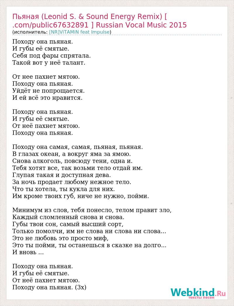Походу она пьяная. И губы её смятые. Себя под фары спрятала. Такой вот у неё талант. От нее пахнет мятою. Походу она пьяная. Уйдёт не попрощается. И ей всё это нравится. Походу она пьяная. И губы её смятые. От неё пахнет мятою. Походу она пьяная. Походу она самая, самая, пьяная, пьяная. В глазах океан, а вокруг яма за ямою. Снова алкоголь, повсюду тени, одна и. Тебя хотят все, так возьми тело отдай им. Глупая такая и доступная дева. За ночь продает любому нежное тело. Что ты хотела, ты кукла для них. Им кроме твоих губ, ниче не нужно, пойми. Минимум из слов, тебя понесло, телом правит зло, Каждый сломленный снова и снова. Губы твои сон, самый высший сорт, Только помолчи, им не слова ни слова ни слова... Это не любовь это просто миф, Это ты пойми, ты останешься в сказке на долго... И вновь ... Походу она пьяная. И губы её смятые. От неё пахнет мятою. Походу она пьяная. (3х)