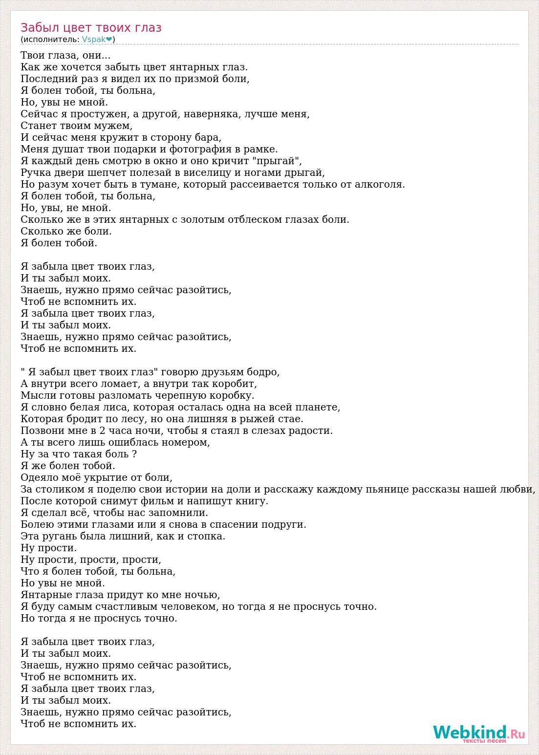 Твои глаза, они... Как же хочется забыть цвет янтарных глаз. Последний раз я видел их по призмой боли, Я болен тобой, ты больна, Но, увы не мной. Сейчас я простужен, а другой, наверняка, лучше меня, Станет твоим мужем, И сейчас меня кружит в сторону бара, Меня душат твои подарки и фотография в рамке. Я каждый день смотрю в окно и оно кричит "прыгай", Ручка двери шепчет полезай в виселицу и ногами дрыгай, Но разум хочет быть в тумане, который рассеивается только от алкоголя. Я болен тобой, ты больна, Но, увы, не мной. Сколько же в этих янтарных с золотым отблеском глазах боли. Сколько же боли. Я болен тобой. Я забыла цвет твоих глаз, И ты забыл моих. Знаешь, нужно прямо сейчас разойтись, Чтоб не вспомнить их. Я забыла цвет твоих глаз, И ты забыл моих. Знаешь, нужно прямо сейчас разойтись, Чтоб не вспомнить их. " Я забыл цвет твоих глаз" говорю друзьям бодро, А внутри всего ломает, а внутри так коробит, Мысли готовы разломать черепную коробку. Я словно белая лиса, которая осталась одна на всей планете, Которая бродит по лесу, но она лишняя в рыжей стае. Позвони мне в 2 часа ночи, чтобы я стаял в слезах радости. А ты всего лишь ошиблась номером, Ну за что такая боль ? Я же болен тобой. Одеяло моё укрытие от боли, За столиком я поделю свои истории на доли и расскажу каждому пьянице рассказы нашей любви, После которой снимут фильм и напишут книгу. Я сделал всё, чтобы нас запомнили. Болею этими глазами или я снова в спасении подруги. Эта ругань была лишний, как и стопка. Ну прости. Ну прости, прости, прости, Что я болен тобой, ты больна, Но увы не мной. Янтарные глаза придут ко мне ночью, Я буду самым счастливым человеком, но тогда я не проснусь точно. Но тогда я не проснусь точно. Я забыла цвет твоих глаз, И ты забыл моих. Знаешь, нужно прямо сейчас разойтись, Чтоб не вспомнить их. Я забыла цвет твоих глаз, И ты забыл моих. Знаешь, нужно прямо сейчас разойтись, Чтоб не вспомнить их.