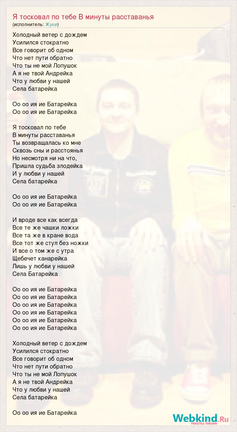 Холодный ветер с дождем Усилился стократно Все говорит об одном Что нет пути обратно Что ты не мой Лопушок А я не твой Андрейка Что у любви у нашей Села батарейка Оо оо ия ие Батарейка Оо оо ия ие Батарейка Я тосковал по тебе В минуты расставанья Ты возвращалась ко мне Сквозь сны и расстоянья Но несмотря ни на что, Пришла судьба злодейка И у любви у нашей Села батарейка Оо оо ия ие Батарейка Оо оо ия ие Батарейка И вроде все как всегда Все те же чашки ложки Все та же в кране вода Все тот же стул без ножки И все о том же с утра Щебечет канарейка Лишь у любви у нашей Села Батарейка Оо оо ия ие Батарейка Оо оо ия ие Батарейка Оо оо ия ие Батарейка Оо оо ия ие Батарейка Оо оо ия ие Батарейка Оо оо ия ие Батарейка Холодный ветер с дождем Усилился стократно Все говорит об одном Что нет пути обратно Что ты не мой Лопушок А я не твой Андрейка Что у любви у нашей Села батарейка Оо оо ия ие Батарейка