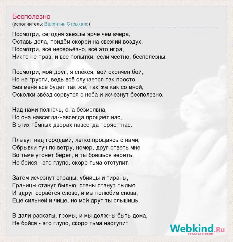 Посмотри, сегодня звёзды ярче чем вчера, Оставь дела, пойдём скорей на свежий воздух. Посмотри, всё несерьёзно, всё это игра, Никто не прав, и все попытки, если честно, бесполезны. Посмотри, мой друг, я спёкся, мой окончен бой, Но не грусти, ведь всё случается так просто. Без меня всё будет так же, так же как со мной, Осколки звёзд сорвутся с неба и исчезнут бесполезно. Над нами полночь, она безмолвна, Но она навсегда-навсегда прощает нас, В этих тёмных дворах навсегда теряет нас. Плывут над городами, легко прощаясь с нами, Обрывки туч по ветру, номер, друг ответь мне Во тьме утонет берег, и ты боишься верить. Не бойся - это глупо, скоро тьма отступит. Затем исчезнут страны, убийцы и тираны, Границы станут былью, стены станут пылью. И вдруг сорвётся слово, и мы полюбим снова, Еще сильней и чище, но мой друг ты слышишь. В дали раскаты, громы, и мы должны быть дома, Не бойся - это глупо, скоро тьма наступит