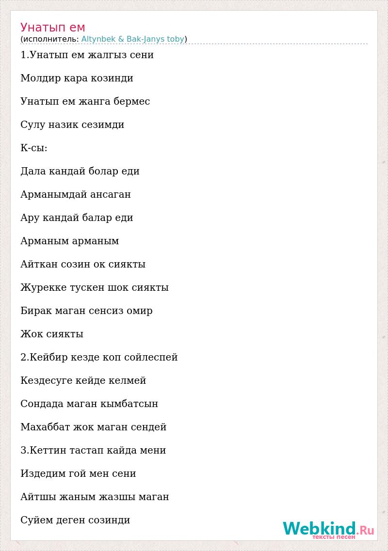 1.Унатып ем жалгыз сени Молдир кара козинди Унатып ем жанга бермес Сулу назик сезимди К-сы: Дала кандай болар еди Арманымдай ансаган Ару кандай балар еди Арманым арманым Айткан созин ок сиякты Журекке тускен шок сиякты Бирак маган сенсиз омир Жок сиякты 2.Кейбир кезде коп сойлеспей Кездесуге кейде келмей Сондада маган кымбатсын Махаббат жок маган сендей 3.Кеттин тастап кайда мени Издедим гой мен сени Айтшы жаным жазшы маган Суйем деген созинди
