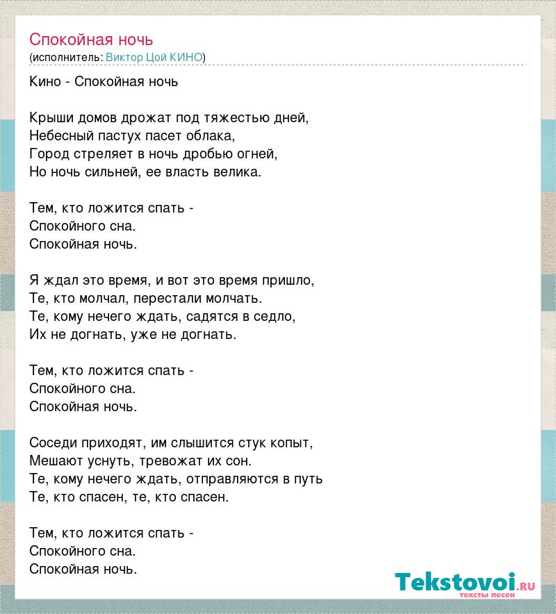 Кино - Спокойная ночь Крыши домов дрожат под тяжестью дней, Небесный пастух пасет облака, Город стреляет в ночь дробью огней, Но ночь сильней, ее власть велика. Тем, кто ложится спать - Спокойного сна. Спокойная ночь. Я ждал это время, и вот это время пришло, Те, кто молчал, перестали молчать. Те, кому нечего ждать, садятся в седло, Их не догнать, уже не догнать. Тем, кто ложится спать - Спокойного сна. Спокойная ночь. Соседи приходят, им слышится стук копыт, Мешают уснуть, тревожат их сон. Те, кому нечего ждать, отправляются в путь Те, кто спасен, те, кто спасен. Тем, кто ложится спать - Спокойного сна. Спокойная ночь.