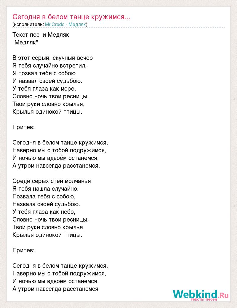 Текст песни Медляк "Медляк" В этот серый, скучный вечер Я тебя случайно встретил, Я позвал тебя с собою И назвал своей судьбою. У тебя глаза как море, Словно ночь твои ресницы. Твои руки словно крылья, Крылья одинокой птицы. Припев: Сегодня в белом танце кружимся, Наверно мы с тобой подружимся, И ночью мы вдвоём останемся, А утром навсегда расстанемся. Среди серых стен молчанья Я тебя нашла случайно. Позвала тебя с собою, Назвала своей судьбою. У тебя глаза как небо, Словно ночь твои ресницы. Твои руки словно крылья, Крылья одинокой птицы. Припев: Сегодня в белом танце кружимся, Наверно мы с тобой подружимся, И ночью мы вдвоём останемся, А утром навсегда расстанемся