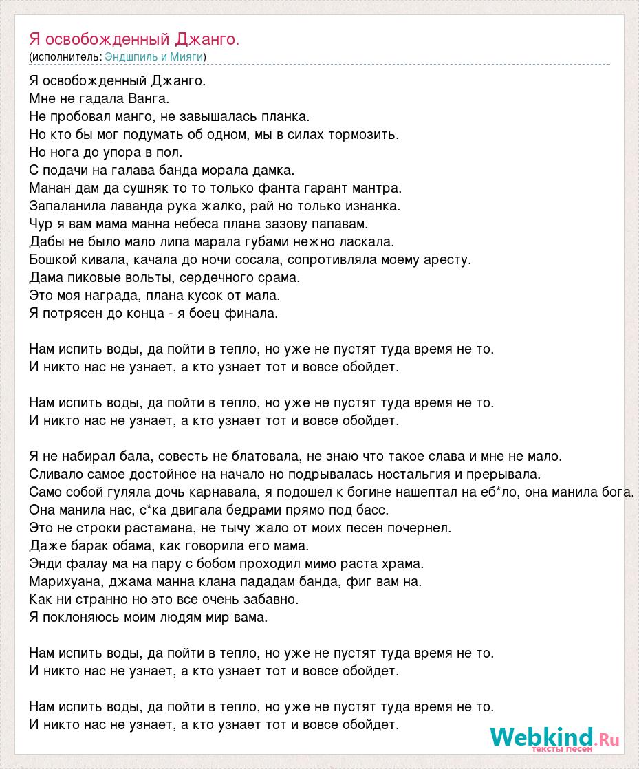 Я освобожденный Джанго. Мне не гадала Ванга. Не пробовал манго, не завышалась планка. Но кто бы мог подумать об одном, мы в силах тормозить. Но нога до упора в пол. С подачи на галава банда морала дамка. Манан дам да сушняк то то только фанта гарант мантра. Запаланила лаванда рука жалко, рай но только изнанка. Чур я вам мама манна небеса плана зазову папавам. Дабы не было мало липа марала губами нежно ласкала. Бошкой кивала, качала до ночи сосала, сопротивляла моему аресту. Дама пиковые вольты, сердечного срама. Это моя награда, плана кусок от мала. Я потрясен до конца - я боец финала. Нам испить воды, да пойти в тепло, но уже не пустят туда время не то. И никто нас не узнает, а кто узнает тот и вовсе обойдет. Нам испить воды, да пойти в тепло, но уже не пустят туда время не то. И никто нас не узнает, а кто узнает тот и вовсе обойдет. Я не набирал бала, совесть не блатовала, не знаю что такое слава и мне не мало. Сливало самое достойное на начало но подрывалась ностальгия и прерывала. Само собой гуляла дочь карнавала, я подошел к богине нашептал на еб*ло, она манила бога. Она манила нас, с*ка двигала бедрами прямо под басс. Это не строки растамана, не тычу жало от моих песен почернел. Даже барак обама, как говорила его мама. Энди фалау ма на пару с бобом проходил мимо раста храма. Марихуана, джама манна клана пададам банда, фиг вам на. Как ни странно но это все очень забавно. Я поклоняюсь моим людям мир вама. Нам испить воды, да пойти в тепло, но уже не пустят туда время не то. И никто нас не узнает, а кто узнает тот и вовсе обойдет. Нам испить воды, да пойти в тепло, но уже не пустят туда время не то. И никто нас не узнает, а кто узнает тот и вовсе обойдет.