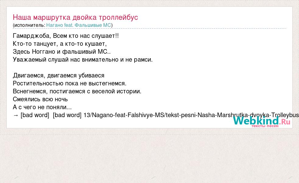 Гамарджоба, Всем кто нас слушает!! Кто-то танцует, а кто-то кушает, Здесь Ноггано и фальшивый МС.. Уважаемый слушай нас внимательно и не рамси. Двигаемся, двигаемся убиваеся Ростительностью пока не выстегнемся. Вснегнемся, постигаемся с веселой истории. Смеялись всю ночь А с чего не поняли... → [bad word] [bad word] 13/Nagano-feat-Falshivye-MS/tekst-pesni-Nasha-Marshrutka-dvoyka-Trolleybus