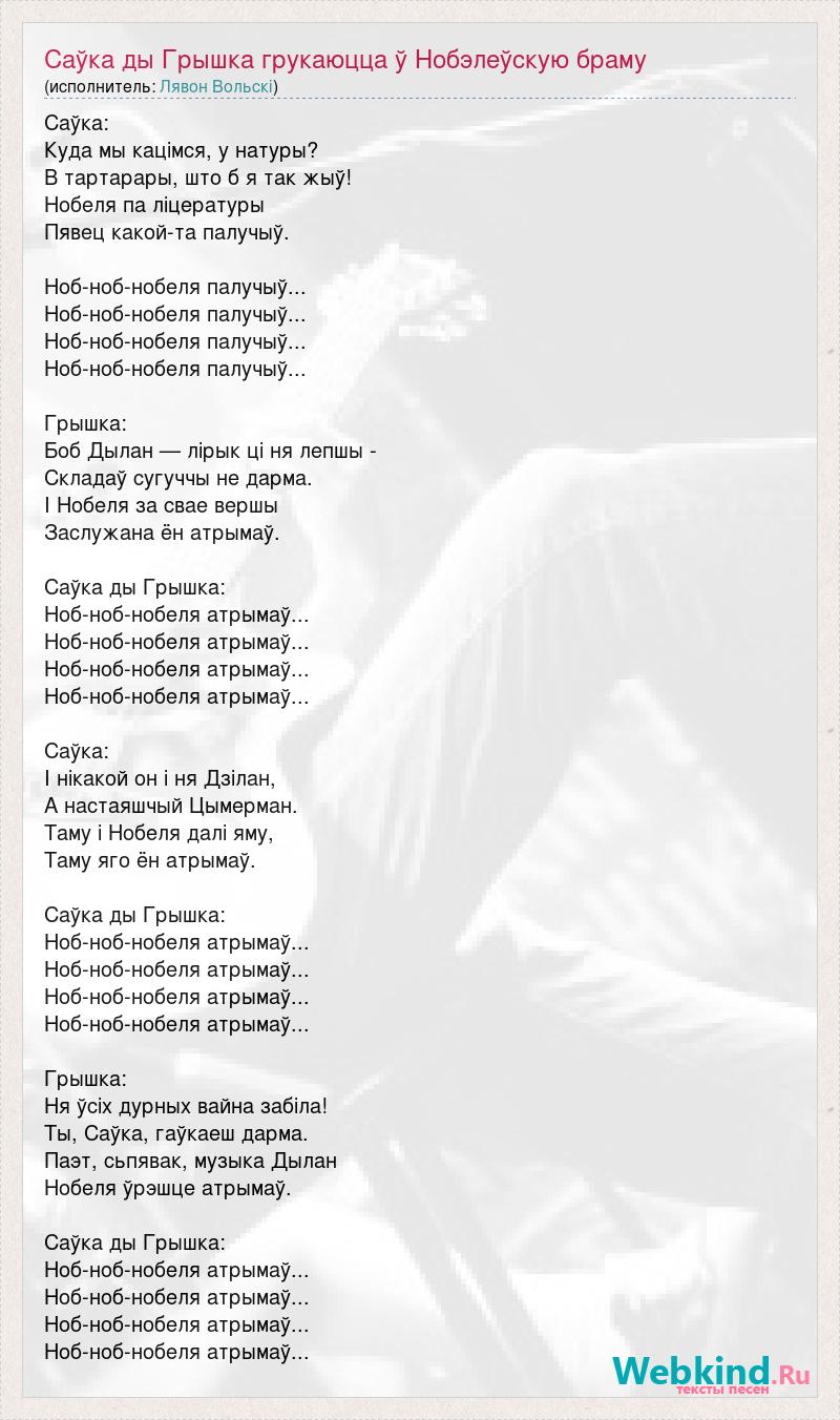 Саўка: Куда мы кацімся, у натуры? В тартарары, што б я так жыў! Нобеля па ліцературы Пявец какой-та палучыў. Ноб-ноб-нобеля палучыў... Ноб-ноб-нобеля палучыў... Ноб-ноб-нобеля палучыў... Ноб-ноб-нобеля палучыў... Грышка: Боб Дылан — лірык ці ня лепшы - Складаў сугуччы не дарма. І Нобеля за свае вершы Заслужана ён атрымаў. Саўка ды Грышка: Ноб-ноб-нобеля атрымаў... Ноб-ноб-нобеля атрымаў... Ноб-ноб-нобеля атрымаў... Ноб-ноб-нобеля атрымаў... Саўка: І нікакой он і ня Дзілан, А настаяшчый Цымерман. Таму і Нобеля далі яму, Таму яго ён атрымаў. Саўка ды Грышка: Ноб-ноб-нобеля атрымаў... Ноб-ноб-нобеля атрымаў... Ноб-ноб-нобеля атрымаў... Ноб-ноб-нобеля атрымаў... Грышка: Ня ўсіх дурных вайна забіла! Ты, Саўка, гаўкаеш дарма. Паэт, сьпявак, музыка Дылан Нобеля ўрэшце атрымаў. Саўка ды Грышка: Ноб-ноб-нобеля атрымаў... Ноб-ноб-нобеля атрымаў... Ноб-ноб-нобеля атрымаў... Ноб-ноб-нобеля атрымаў...