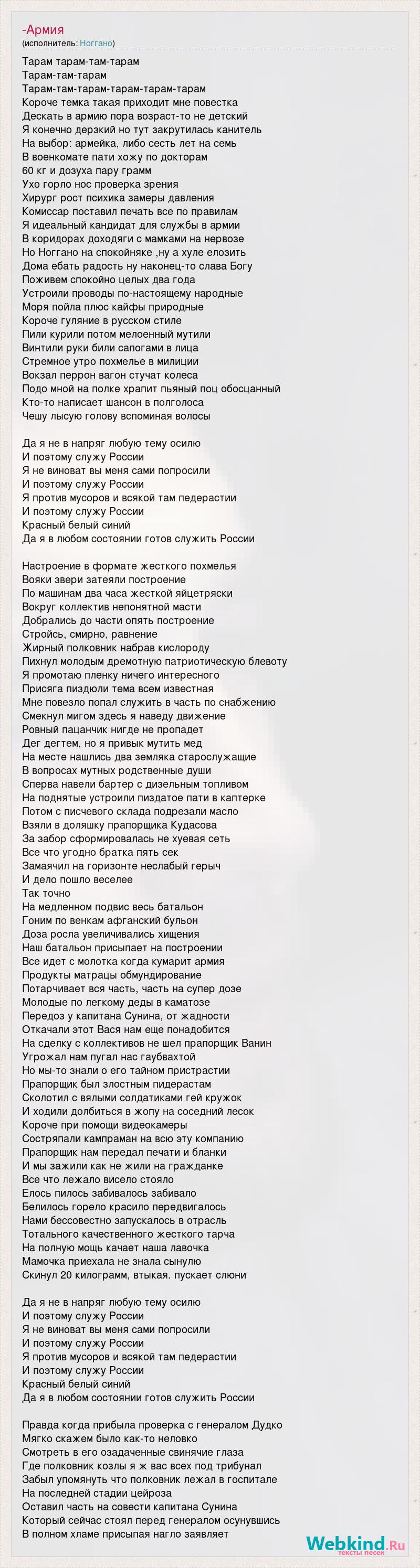 Тарам тарам-там-тарам Тарам-там-тарам Тарам-там-тарам-тарам-тарам-тарам Короче темка такая приходит мне повестка Дескать в армию пора возраст-то не детский Я конечно дерзкий но тут закрутилась канитель На выбор: армейка, либо сесть лет на семь В военкомате пати хожу по докторам 60 кг и дозуха пару грамм Ухо горло нос проверка зрения Хирург рост психика замеры давления Комиссар поставил печать все по правилам Я идеальный кандидат для службы в армии В коридорах доходяги с мамками на нервозе Но Ноггано на спокойняке ,ну а хуле елозить Дома ебать радость ну наконец-то слава Богу Поживем спокойно целых два года Устроили проводы по-настоящему народные Моря пойла плюс кайфы природные Короче гуляние в русском стиле Пили курили потом мелоенный мутили Винтили руки били сапогами в лица Стремное утро похмелье в милиции Вокзал перрон вагон стучат колеса Подо мной на полке храпит пьяный поц обосцанный Кто-то написает шансон в полголоса Чешу лысую голову вспоминая волосы Да я не в напряг любую тему осилю И поэтому служу России Я не виноват вы меня сами попросили И поэтому служу России Я против мусоров и всякой там педерастии И поэтому служу России Красный белый синий Да я в любом состоянии готов служить России Настроение в формате жесткого похмелья Вояки звери затеяли построение По машинам два часа жесткой яйцетряски Вокруг коллектив непонятной масти Добрались до части опять построение Стройсь, смирно, равнение Жирный полковник набрав кислороду Пихнул молодым дремотную патриотическую блевоту Я промотаю пленку ничего интересного Присяга пиздюли тема всем известная Мне повезло попал служить в часть по снабжению Смекнул мигом здесь я наведу движение Ровный пацанчик нигде не пропадет Дег дегтем, но я привык мутить мед На месте нашлись два земляка старослужащие В вопросах мутных родственные души Сперва навели бартер с дизельным топливом На поднятые устроили пиздатое пати в каптерке Потом с писчевого склада подрезали масло Взяли в доляшку прапорщика Кудасова За забор сформировалась не хуевая сеть Все что угодно братка пять сек Замаячил на горизонте неслабый герыч И дело пошло веселее Так точно На медленном подвис весь батальон Гоним по венкам афганский бульон Доза росла увеличивались хищения Наш батальон присыпает на построении Все идет с молотка когда кумарит армия Продукты матрацы обмундирование Потарчивает вся часть, часть на супер дозе Молодые по легкому деды в каматозе Передоз у капитана Сунина, от жадности Откачали этот Вася нам еще понадобится На сделку с коллективов не шел прапорщик Ванин Угрожал нам пугал нас гаубвахтой Но мы-то знали о его тайном пристрастии Прапорщик был злостным пидерастам Сколотил с вялыми солдатиками гей кружок И ходили долбиться в жопу на соседний лесок Короче при помощи видеокамеры Состряпали кампраман на всю эту компанию Прапорщик нам передал печати и бланки И мы зажили как не жили на гражданке Все что лежало висело стояло Елось пилось забивалось забивало Белилось горело красило передвигалось Нами бессовестно запускалось в отрасль Тотального качественного жесткого тарча На полную мощь качает наша лавочка Мамочка приехала не знала сынулю Скинул 20 килограмм, втыкая. пускает слюни Да я не в напряг любую тему осилю И поэтому служу России Я не виноват вы меня сами попросили И поэтому служу Росси
