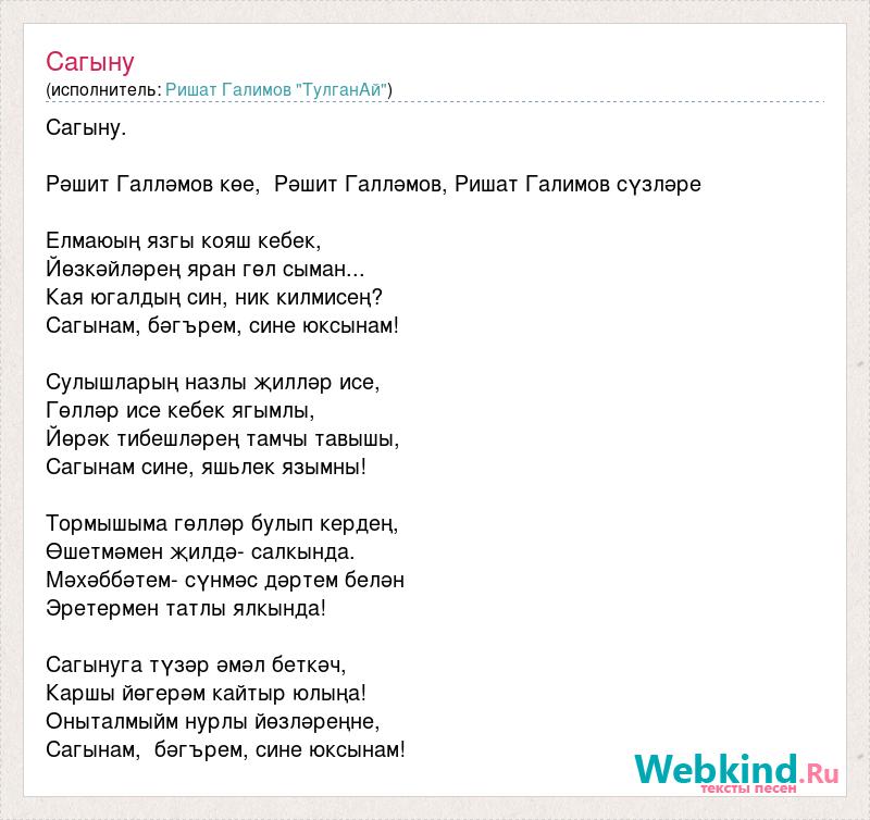 Сагыну. Рәшит Галләмов көе, Рәшит Галләмов, Ришат Галимов сүзләре Елмаюың язгы кояш кебек, Йөзкәйләрең яран гөл сыман... Кая югалдың син, ник килмисең? Сагынам, бәгърем, сине юксынам! Сулышларың назлы җилләр исе, Гөлләр исе кебек ягымлы, Йөрәк тибешләрең тамчы тавышы, Сагынам сине, яшьлек язымны! Тормышыма гөлләр булып кердең, Өшетмәмен җилдә- салкында. Мәхәббәтем- сүнмәс дәртем белән Эретермен татлы ялкында! Сагынуга түзәр әмәл беткәч, Каршы йөгерәм кайтыр юлыңа! Оныталмыйм нурлы йөзләреңне, Сагынам, бәгърем, сине юксынам!