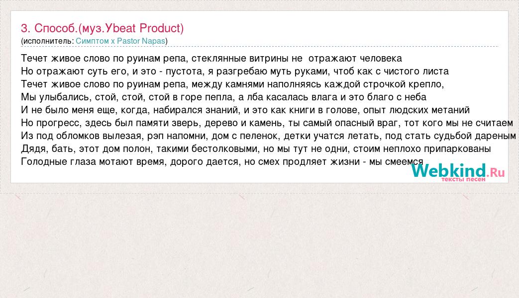 Течет живое слово по руинам репа, стеклянные витрины не отражают человека Но отражают суть его, и это - пустота, я разгребаю муть руками, чтоб как с чистого листа Течет живое слово по руинам репа, между камнями наполняясь каждой строчкой крепло, Мы улыбались, стой, стой, стой в горе пепла, а лба касалась влага и это благо с неба И не было меня еще, когда, набирался знаний, и это как книги в голове, опыт людских метаний Но прогресс, здесь был памяти зверь, дерево и камень, ты самый опасный враг, тот кого мы не считаем Из под обломков вылезая, рэп напомни, дом с пеленок, детки учатся летать, под стать судьбой дареным Дядя, бать, этот дом полон, такими бестолковыми, но мы тут не одни, стоим неплохо припаркованы Голодные глаза мотают время, дорого дается, но смех продляет жизни - мы смеемся