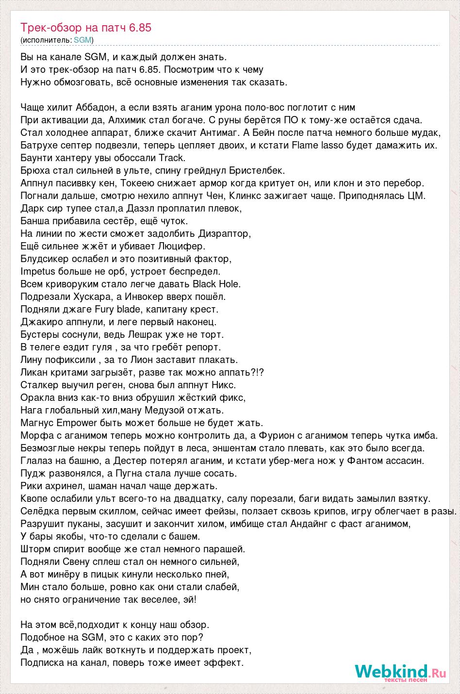 Вы на канале SGM, и каждый должен знать. И это трек-обзор на патч 6.85. Посмотрим что к чему Нужно обмозговать, всё основные изменения так сказать. Чаще хилит Аббадон, а если взять аганим урона поло-вос поглотит с ним При активации да, Алхимик стал богаче. С руны берётся ПО к тому-же остаётся сдача. Стал холоднее аппарат, ближе скачит Антимаг. А Бейн после патча немного больше мудак, Батрухе септер подвезли, теперь цепляет двоих, и кстати Flame lasso будет дамажить их. Баунти хантеру увы обоссали Track. Брюха стал сильней в ульте, спину грейднул Бристелбек. Аппнул пасиввку кен, Токеею снижает армор когда критует он, или клон и это перебор. Погнали дальше, смотрю нехило аппнут Чен, Клинкс зажигает чаще. Приподнялась ЦМ. Дарк сир тупее стал,а Даззл проплатил плевок, Банша прибавила сестёр, ещё чуток. На линии по жести сможет задолбить Дизраптор, Ещё сильнее жжёт и убивает Люцифер. Блудсикер ослабел и это позитивный фактор, Impetus больше не орб, устроет беспредел. Всем криворуким стало легче давать Black Hole. Подрезали Хускара, а Инвокер вверх пошёл. Подняли джаге Fury blade, капитану крест. Джакиро аппнули, и леге первый наконец. Бустеры соснули, ведь Лешрак уже не торт. В телеге ездит гуля , за что гребёт репорт. Лину пофиксили , за то Лион заставит плакать. Ликан критами загрызёт, разве так можно аппать?!? Сталкер выучил реген, снова был аппнут Никс. Оракла вниз как-то вниз обрушил жёсткий фикс, Нага глобальный хил,ману Медузой отжать. Магнус Empower быть может больше не будет жать. Морфа с аганимом теперь можно контролить да, а Фурион с аганимом теперь чутка имба. Безмозглые некры теперь пойдут в леса, эншентам стало плевать, как это было всегда. Глалаз на башню, а Дестер потерял аганим, и кстати убер-мега нож у Фантом ассасин. Пудж развонялся, а Пугна стала лучше сосать. Рики ахринел, шаман начал чаще держать. Квопе ослабили ульт всего-то на двадцатку, салу порезали, баги видать замылил взятку. Селёдка первым скиллом, сейчас имеет фейзы, ползает сквозь крипов, игру облегчает в разы. Разрушит пуканы, засушит и закончит хилом, имбище стал Андайнг с фаст аганимом, У бары якобы, что-то сделали с башем. Шторм спирит вообще же стал немного парашей. Подняли Свену сплеш стал он немного сильней, А вот минёру в пицык кинули несколько пней, Мин стало больше, ровно как они стали слабей, но снято ограничение так веселее, эй! На этом всё,подходит к концу наш обзор. Подобное на SGM, это с каких это пор? Да , можёшь лайк воткнуть и поддержать проект, Подписка на канал, поверь тоже имеет эффект.