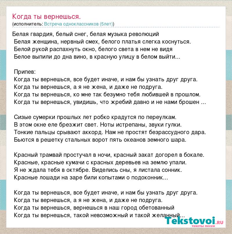 Белая гвардия, белый снег, белая музыка революций Белая женщина, нервный смех, белого платья слегка коснуться. Белой рукой распахнуть окно, белого света в нем не видя Белое выпили до дна вино, в красную улицу в белом выйти... Припев: Когда ты вернешься, все будет иначе, и нам бы узнать друг друга. Когда ты вернешься, а я не жена, и даже не подруга. Когда ты вернешься, ко мне так безумно тебя любившей в прошлом. Когда ты вернешься, увидишь, что жребий давно и не нами брошен ... Сизые сумерки прошлых лет робко крадутся по переулкам. В этом окне еле брезжит свет. Ноты истрепаны, звуки гулки. Тонкие пальцы срывают аккорд. Нам не простят безрассудного дара. Бьются в решетку стальных ворот пять океанов земного шара. Красный трамвай простучал в ночи, красный закат догорел в бокале. Красные, красные кумачи с красных деревьев на землю упали. Я не ждала тебя в октябре. Виделись сны, я листала сонник. Красные лошади на заре били копытами о подоконник... Когда ты вернешься, все будет иначе, и нам бы узнать друг друга. Когда ты вернешься, а я не жена, и даже не подруга. Когда ты вернешься, вернешься в наш город обетованный Когда ты вернешься, такой невозможный и такой желанный...