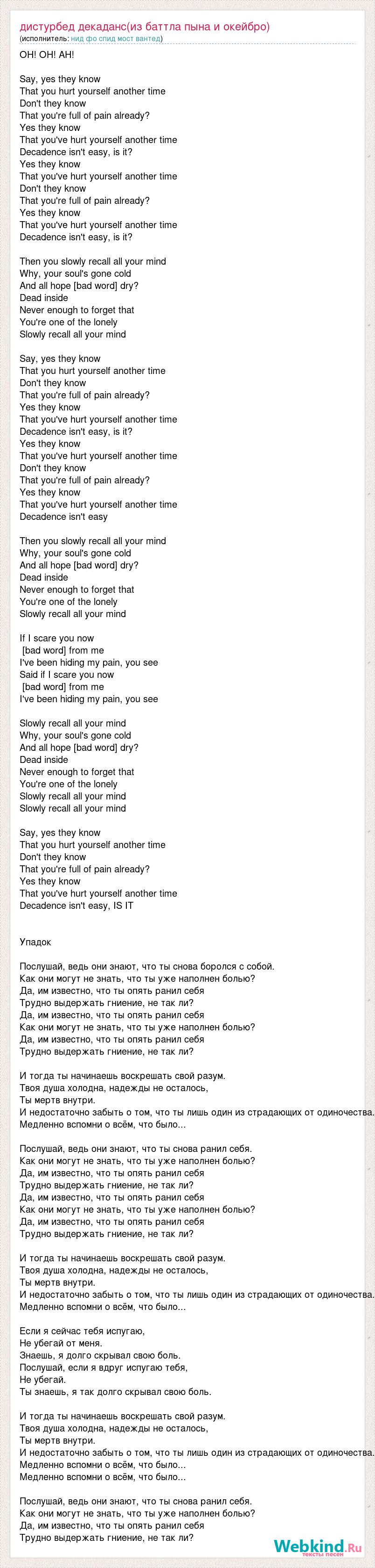 OH! OH! AH! Say, yes they know That you hurt yourself another time Don't they know That you're full of pain already? Yes they know That you've hurt yourself another time Decadence isn't easy, is it? Yes they know That you've hurt yourself another time Don't they know That you're full of pain already? Yes they know That you've hurt yourself another time Decadence isn't easy, is it? Then you slowly recall all your mind Why, your soul's gone cold And all hope [bad word] dry? Dead inside Never enough to forget that You're one of the lonely Slowly recall all your mind Say, yes they know That you hurt yourself another time Don't they know That you're full of pain already? Yes they know That you've hurt yourself another time Decadence isn't easy, is it? Yes they know That you've hurt yourself another time Don't they know That you're full of pain already? Yes they know That you've hurt yourself another time Decadence isn't easy Then you slowly recall all your mind Why, your soul's gone cold And all hope [bad word] dry? Dead inside Never enough to forget that You're one of the lonely Slowly recall all your mind If I scare you now [bad word] from me I've been hiding my pain, you see Said if I scare you now [bad word] from me I've been hiding my pain, you see Slowly recall all your mind Why, your soul's gone cold And all hope [bad word] dry? Dead inside Never enough to forget that You're one of the lonely Slowly recall all your mind Slowly recall all your mind Say, yes they know That you hurt yourself another time Don't they know That you're full of pain already? Yes they know That you've hurt yourself another time Decadence isn't easy, IS IT Упадок Послушай, ведь они знают, что ты снова боролся с собой. Как они могут не знать, что ты уже наполнен болью? Да, им известно, что ты опять ранил себя Трудно выдержать гниение, не так ли? Да, им известно, что ты опять ранил себя Как они могут не знать, что ты уже наполнен болью? Да, им известно, что ты опять ранил себя Трудно выдержать гниение, не так ли? И тогда ты начинаешь воскрешать свой разум. Твоя душа холодна, надежды не осталось, Ты мертв внутри. И недостаточно забыть о том, что ты лишь один из страдающих от одиночества. Медленно вспомни о всём, что было... Послушай, ведь они знают, что ты снова ранил себя. Как они могут не знать, что ты уже наполнен болью? Да, им известно, что ты опять ранил себя Трудно выдержать гниение, не так ли? Да, им известно, что ты опять ранил себя Как они могут не знать, что ты уже наполнен болью? Да, им известно, что ты опять ранил себя Трудно выдержать гниение, не так ли? И тогда ты начинаешь воскрешать свой разум. Твоя душа холодна, надежды не осталось, Ты мертв внутри. И недостаточно забыть о том, что ты лишь один из страдающих от одиночества. Медленно вспомни о всём, что было... Если я сейчас тебя испугаю, Не убегай от меня. Знаешь, я долго скрывал свою боль. Послушай, если я вдруг испугаю тебя, Не убегай. Ты знаешь, я так долго скрывал свою боль. И тогда ты начинаешь воскрешать свой разум. Твоя душа холодна, надежды не осталось, Ты мертв внутри. И недостаточно забыть о том, что ты лишь один из страдающих от одиночества. Медленно вспомни о всём, что было... Медленно вспомни о всём, что было... Послушай, ведь они знают, что ты снова ранил себя. Как они могут не знать, что ты уже наполнен болью? Да, им известно, что ты опять ранил себя Трудно выдержать гниение, не так ли?