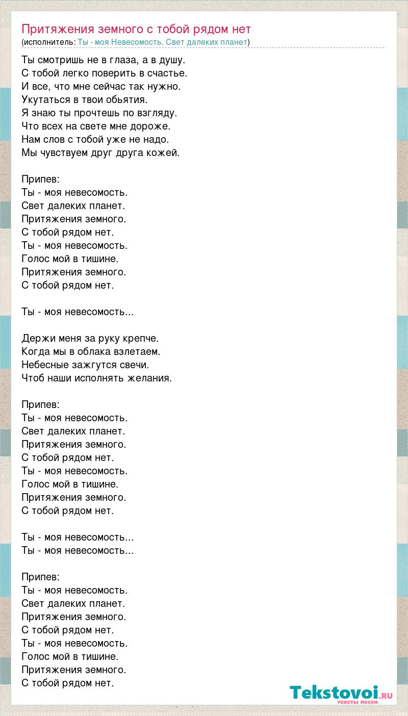 Ты смотришь не в глаза, а в душу. С тобой легко поверить в счастье. И все, что мне сейчас так нужно. Укутаться в твои обьятия. Я знаю ты прочтешь по взгляду. Что всех на свете мне дороже. Нам слов с тобой уже не надо. Мы чувствуем друг друга кожей. Припев: Ты - моя невесомость. Свет далеких планет. Притяжения земного. С тобой рядом нет. Ты - моя невесомость. Голос мой в тишине. Притяжения земного. С тобой рядом нет. Ты - моя невесомость... Держи меня за руку крепче. Когда мы в облака взлетаем. Небесные зажгутся свечи. Чтоб наши исполнять желания. Припев: Ты - моя невесомость. Свет далеких планет. Притяжения земного. С тобой рядом нет. Ты - моя невесомость. Голос мой в тишине. Притяжения земного. С тобой рядом нет. Ты - моя невесомость... Ты - моя невесомость... Припев: Ты - моя невесомость. Свет далеких планет. Притяжения земного. С тобой рядом нет. Ты - моя невесомость. Голос мой в тишине. Притяжения земного. С тобой рядом нет.
