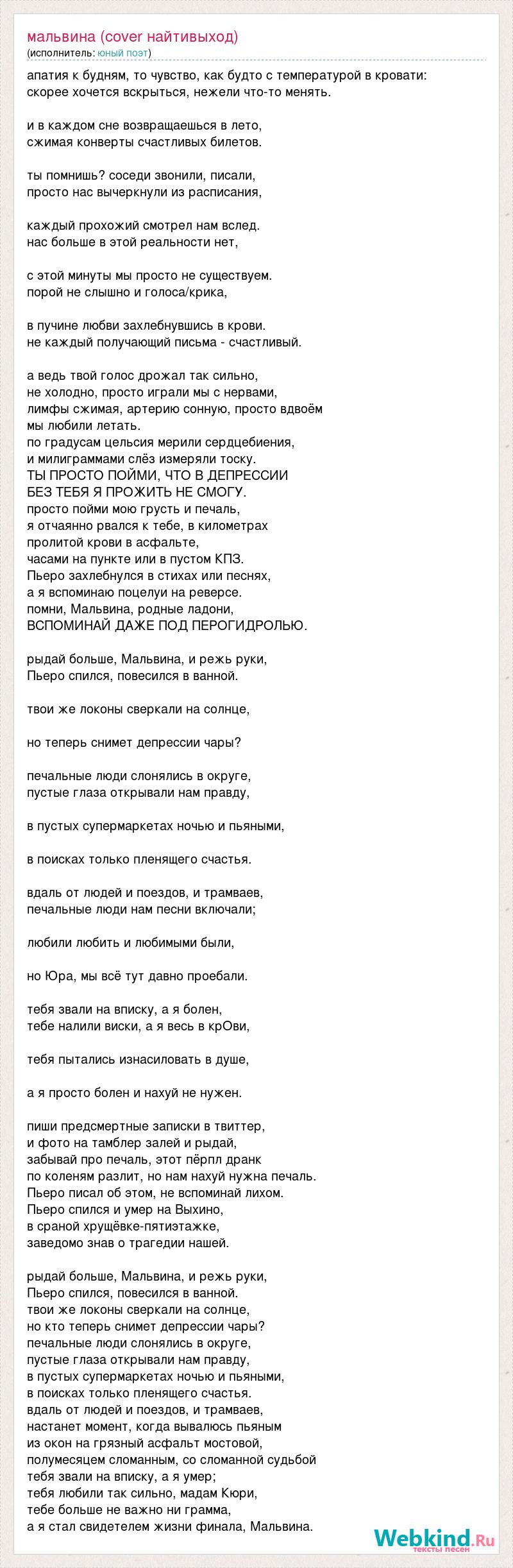 апатия к будням, то чувство, как будто с температурой в кровати: скорее хочется вскрыться, нежели что-то менять. и в каждом сне возвращаешься в лето, сжимая конверты счастливых билетов. ты помнишь? соседи звонили, писали, просто нас вычеркнули из расписания, каждый прохожий смотрел нам вслед. нас больше в этой реальности нет, с этой минуты мы просто не существуем. порой не слышно и голоса/крика, в пучине любви захлебнувшись в крови. не каждый получающий письма - счастливый. а ведь твой голос дрожал так сильно, не холодно, просто играли мы с нервами, лимфы сжимая, артерию сонную, просто вдвоём мы любили летать. по градусам цельсия мерили сердцебиения, и милиграммами слёз измеряли тоску. ТЫ ПРОСТО ПОЙМИ, ЧТО В ДЕПРЕССИИ БЕЗ ТЕБЯ Я ПРОЖИТЬ НЕ СМОГУ. просто пойми мою грусть и печаль, я отчаянно рвался к тебе, в километрах пролитой крови в асфальте, часами на пункте или в пустом КПЗ. Пьеро захлебнулся в стихах или песнях, а я вспоминаю поцелуи на реверсе. помни, Мальвина, родные ладони, ВСПОМИНАЙ ДАЖЕ ПОД ПЕРОГИДРОЛЬЮ. рыдай больше, Мальвина, и режь руки, Пьеро спился, повесился в ванной. твои же локоны сверкали на солнце, но теперь снимет депрессии чары? печальные люди слонялись в округе, пустые глаза открывали нам правду, в пустых супермаркетах ночью и пьяными, в поисках только пленящего счастья. вдаль от людей и поездов, и трамваев, печальные люди нам песни включали; любили любить и любимыми были, но Юра, мы всё тут давно проебали. тебя звали на вписку, а я болен, тебе налили виски, а я весь в крОви, тебя пытались изнасиловать в душе, а я просто болен и нахуй не нужен. пиши предсмертные записки в твиттер, и фото на тамблер залей и рыдай, забывай про печаль, этот пёрпл дранк по коленям разлит, но нам нахуй нужна печаль. Пьеро писал об этом, не вспоминай лихом. Пьеро спился и умер на Выхино, в сраной хрущёвке-пятиэтажке, заведомо знав о трагедии нашей. рыдай больше, Мальвина, и режь руки, Пьеро спился, повесился в ванной. твои же локоны сверкали на солнце, но кто теперь снимет депрессии чары? печальные люди слонялись в округе, пустые глаза открывали нам правду, в пустых супермаркетах ночью и пьяными, в поисках только пленящего счастья. вдаль от людей и поездов, и трамваев, настанет момент, когда вывалюсь пьяным из окон на грязный асфальт мостовой, полумесяцем сломанным, со сломанной судьбой тебя звали на вписку, а я умер; тебя любили так сильно, мадам Кюри, тебе больше не важно ни грамма, а я стал свидетелем жизни финала, Мальвина.
