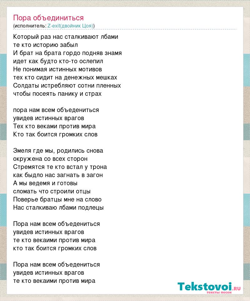 Который раз нас сталкивают лбами те кто историю забыл И брат на брата гордо подняв знамя идет как будто кто-то ослепил Не понимая истинных мотивов тех кто сидит на денежных мешках Солдаты истребляют сотни пленных чтобы посеять панику и страх пора нам всем объедениться увидев истинных врагов Тех кто веками против мира Кто так боится громких слов Змеля где мы, родились снова окружена со всех сторон Стремятся те кто встал у трона как быдло нас загнать в загон А мы ведемя и готовы сломать что строили отцы Поверье братцы мне на слово Нас сталкиваю лбами подлецы Пора нам всем объедениться увидев истинных врагов те кто векаими против мира кто так боится громких слов Пора нам всем объедениться увидев истинных врагов те кто векаими против мира