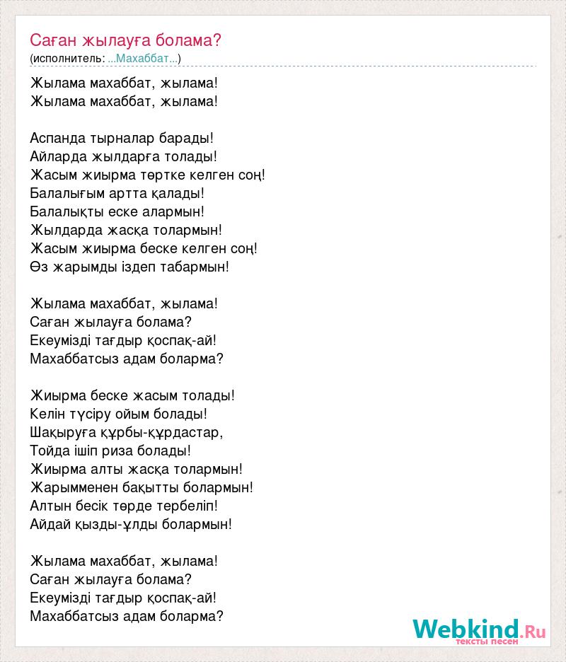 Жылама махаббат, жылама! Жылама махаббат, жылама! Аспанда тырналар барады! Айларда жылдарға толады! Жасым жиырма төртке келген соң! Балалығым артта қалады! Балалықты еске алармын! Жылдарда жасқа толармын! Жасым жиырма беске келген соң! Өз жарымды іздеп табармын! Жылама махаббат, жылама! Саған жылауға болама? Екеумізді тағдыр қоспақ-ай! Махаббатсыз адам боларма? Жиырма беске жасым толады! Келін түсіру ойым болады! Шақыруға құрбы-құрдастар, Тойда ішіп риза болады! Жиырма алты жасқа толармын! Жарымменен бақытты болармын! Алтын бесік төрде тербеліп! Айдай қызды-ұлды болармын! Жылама махаббат, жылама! Саған жылауға болама? Екеумізді тағдыр қоспақ-ай! Махаббатсыз адам боларма?
