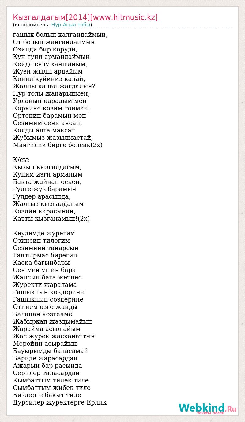 гашык болып калгандаймын, От болып жангандаймын Озинди бир коруди, Кун-туни армандаймын Кейде сулу ханшайым, Жузи жылы ардайым Конил куйиниз калай, Жалпы калай жагдайын? Нур толы жанарынмен, Урланып карадым мен Коркине козим тоймай, Ортенип барамын мен Сезимим сени ансап, Кояды алга максат Жубымыз жазылмастай, Мангилик бирге болсак(2х) К/сы: Кызыл кызгалдагым, Куним изги арманым Бакта жайнап оскен, Гулге жуз барамын Гулдер арасында, Жалгыз кызгалдагым Коздин карасынан, Катты кызганамын!(2х) Кеудемде журегим Озинсин тилегим Сезимнин танарсын Таптырмас бирегин Каска багынбары Сен мен ушин бара Жансын бага жетпес Журекти жаралама Гашыкпын коздерине Гашыкпын создерине Отинем озге жанды Балапан козгелме Жабыркап жаздымайын Жарайма асыл айым Жас журек жасканаттын Мерейин асырайын Бауырымды баласамай Бариде жарасардай Ажарын бар расында Серилер таласардай Кымбаттым тилек тиле Сымбаттым жибек тиле Биздерге бакыт тиле Дурсилер журектерге Ерлик