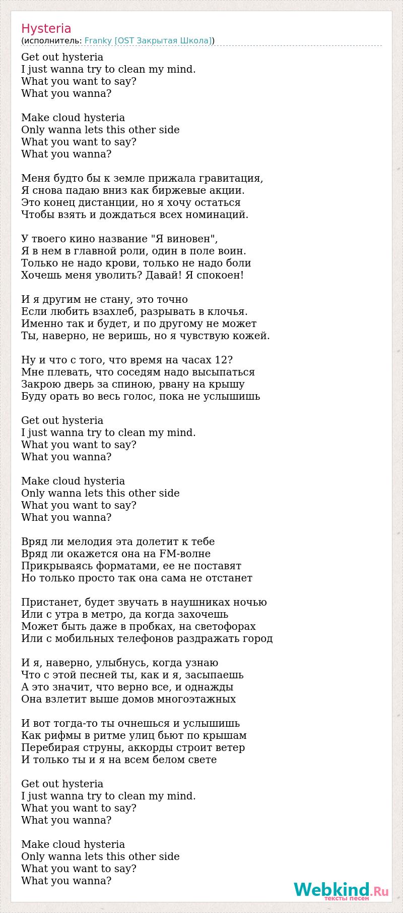 Get out hysteria I just wanna try to clean my mind. What you want to say? What you wanna? Make cloud hysteria Only wanna lets this other side What you want to say? What you wanna? Меня будто бы к земле прижала гравитация, Я снова падаю вниз как биржевые акции. Это конец дистанции, но я хочу остаться Чтобы взять и дождаться всех номинаций. У твоего кино название "Я виновен", Я в нем в главной роли, один в поле воин. Только не надо крови, только не надо боли Хочешь меня уволить? Давай! Я спокоен! И я другим не стану, это точно Если любить взахлеб, разрывать в клочья. Именно так и будет, и по другому не может Ты, наверно, не веришь, но я чувствую кожей. Ну и что с того, что время на часах 12? Мне плевать, что соседям надо высыпаться Закрою дверь за спиною, рвану на крышу Буду орать во весь голос, пока не услышишь Get out hysteria I just wanna try to clean my mind. What you want to say? What you wanna? Make cloud hysteria Only wanna lets this other side What you want to say? What you wanna? Вряд ли мелодия эта долетит к тебе Вряд ли окажется она на FM-волне Прикрываясь форматами, ее не поставят Но только просто так она сама не отстанет Пристанет, будет звучать в наушниках ночью Или с утра в метро, да когда захочешь Может быть даже в пробках, на светофорах Или с мобильных телефонов раздражать город И я, наверно, улыбнусь, когда узнаю Что с этой песней ты, как и я, засыпаешь А это значит, что верно все, и однажды Она взлетит выше домов многоэтажных И вот тогда-то ты очнешься и услышишь Как рифмы в ритме улиц бьют по крышам Перебирая струны, аккорды строит ветер И только ты и я на всем белом свете Get out hysteria I just wanna try to clean my mind. What you want to say? What you wanna? Make cloud hysteria Only wanna lets this other side What you want to say? What you wanna?