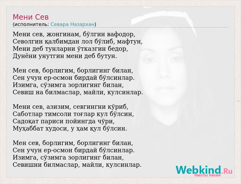 Мени сев, жонгинам, бўлгин вафодор, Севолгин қалбимдан лол бўлиб, мафтун, Мени деб тунларни ўтказгин бедор, Дунёни унутгин мени деб бутун. Мен сев, борлигим, борлигинг билан, Сен учун ер-осмон бирдай бўлсинлар. Изимга, сўзимга зорлигинг билан, Севиш на билмаслар, майли, кулсинлар. Мени сев, азизим, севгингни кўриб, Саботлар тимсоли тоғлар кул бўлсин, Садоқат париси пойингда чўри, Муҳаббат худоси, у ҳам қул бўлсин. Мен сев, борлигим, борлигинг билан, Сен учун ер-осмон бирдай бўлсинлар. Изимга, сўзимга зорлигинг билан, Севишни билмаслар, майли, кулсинлар.
