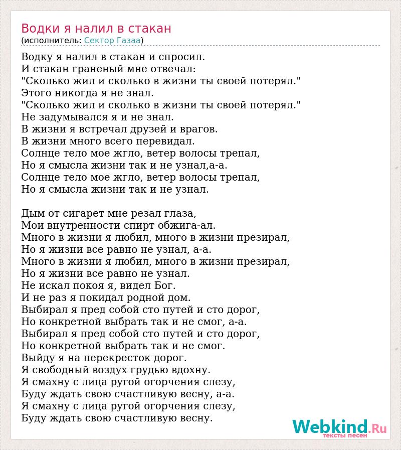 Водку я налил в стакан и спросил. И стакан граненый мне отвечал: "Сколько жил и сколько в жизни ты своей потерял." Этого никогда я не знал. "Сколько жил и сколько в жизни ты своей потерял." Не задумывался я и не знал. В жизни я встречал друзей и врагов. В жизни много всего перевидал. Солнце тело мое жгло, ветер волосы трепал, Но я смысла жизни так и не узнал,а-а. Солнце тело мое жгло, ветер волосы трепал, Но я смысла жизни так и не узнал. Дым от сигарет мне резал глаза, Мои внутренности спирт обжига-ал. Много в жизни я любил, много в жизни презирал, Но я жизни все равно не узнал, а-а. Много в жизни я любил, много в жизни презирал, Но я жизни все равно не узнал. Не искал покоя я, видел Бог. И не раз я покидал родной дом. Выбирал я пред собой сто путей и сто дорог, Но конкретной выбрать так и не смог, а-а. Выбирал я пред собой сто путей и сто дорог, Но конкретной выбрать так и не смог. Выйду я на перекресток дорог. Я свободный воздух грудью вдохну. Я смахну с лица ругой огорчения слезу, Буду ждать свою счастливую весну, а-а. Я смахну с лица ругой огорчения слезу, Буду ждать свою счастливую весну.
