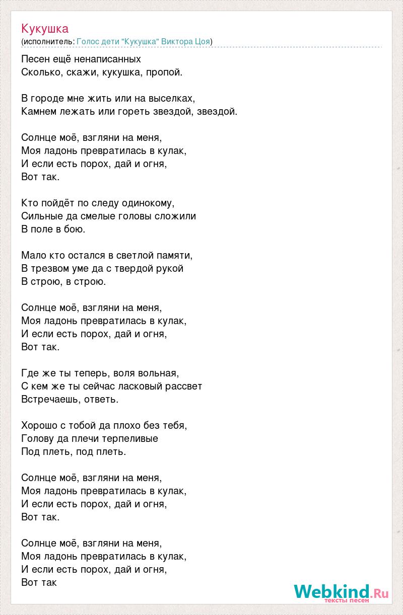 Песен ещё ненаписанных Сколько, cкажи, кукушка, пропой. В городе мне жить или на выселках, Камнем лежать или гореть звездой, звездой. Солнце моё, взгляни на меня, Моя ладонь превратилась в кулак, И если есть порох, дай и огня, Вот так. Кто пойдёт по следу одинокому, Сильные да смелые головы сложили В поле в бою. Мало кто остался в светлой памяти, В трезвом уме да с твердой рукой В строю, в строю. Солнце моё, взгляни на меня, Моя ладонь превратилась в кулак, И если есть порох, дай и огня, Вот так. Где же ты теперь, воля вольная, С кем же ты сейчас ласковый рассвет Встречаешь, ответь. Хорошо с тобой да плохо без тебя, Голову да плечи терпеливые Под плеть, под плеть. Солнце моё, взгляни на меня, Моя ладонь превратилась в кулак, И если есть порох, дай и огня, Вот так. Солнце моё, взгляни на меня, Моя ладонь превратилась в кулак, И если есть порох, дай и огня, Вот так