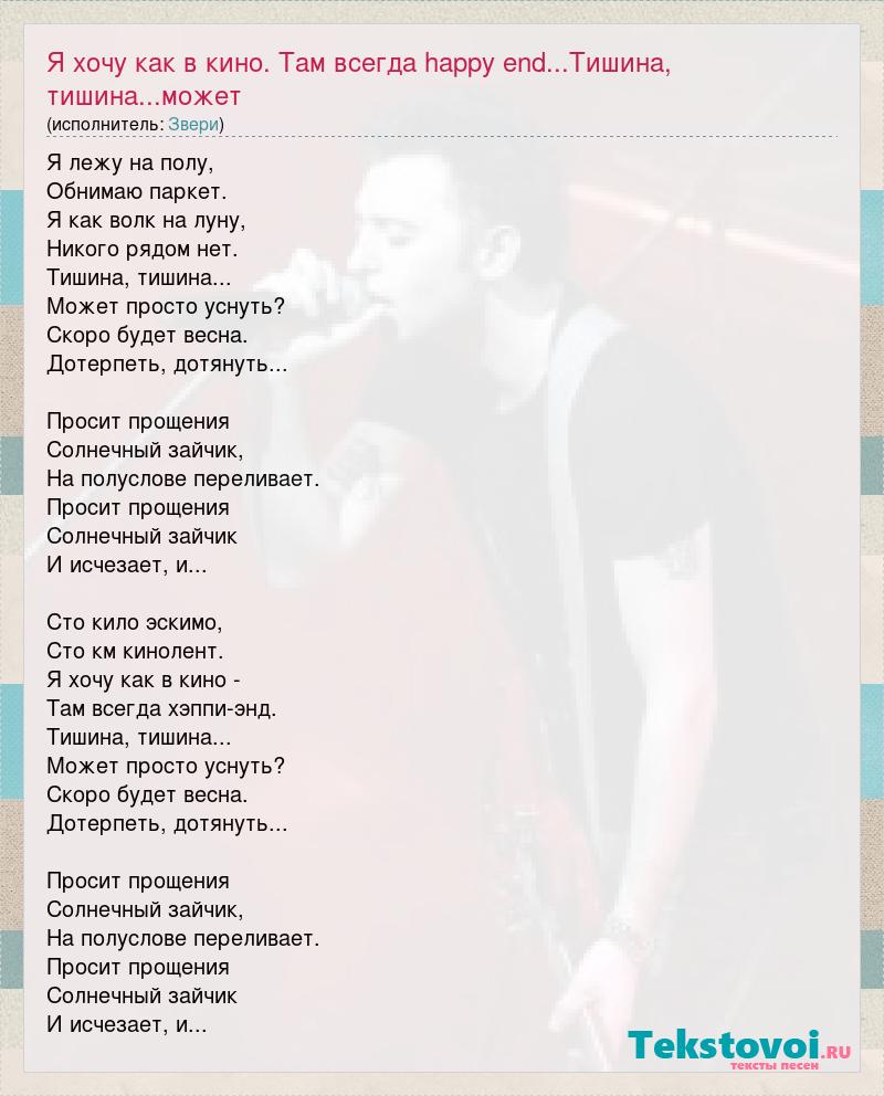 Я лежу на полу, Обнимаю паркет. Я как волк на луну, Никого рядом нет. Тишина, тишина... Может просто уснуть? Скоро будет весна. Дотерпеть, дотянуть... Просит прощения Солнечный зайчик, На полуслове переливает. Просит прощения Солнечный зайчик И исчезает, и... Сто кило эскимо, Сто км кинолент. Я хочу как в кино - Там всегда хэппи-энд. Тишина, тишина... Может просто уснуть? Скоро будет весна. Дотерпеть, дотянуть... Просит прощения Солнечный зайчик, На полуслове переливает. Просит прощения Солнечный зайчик И исчезает, и...