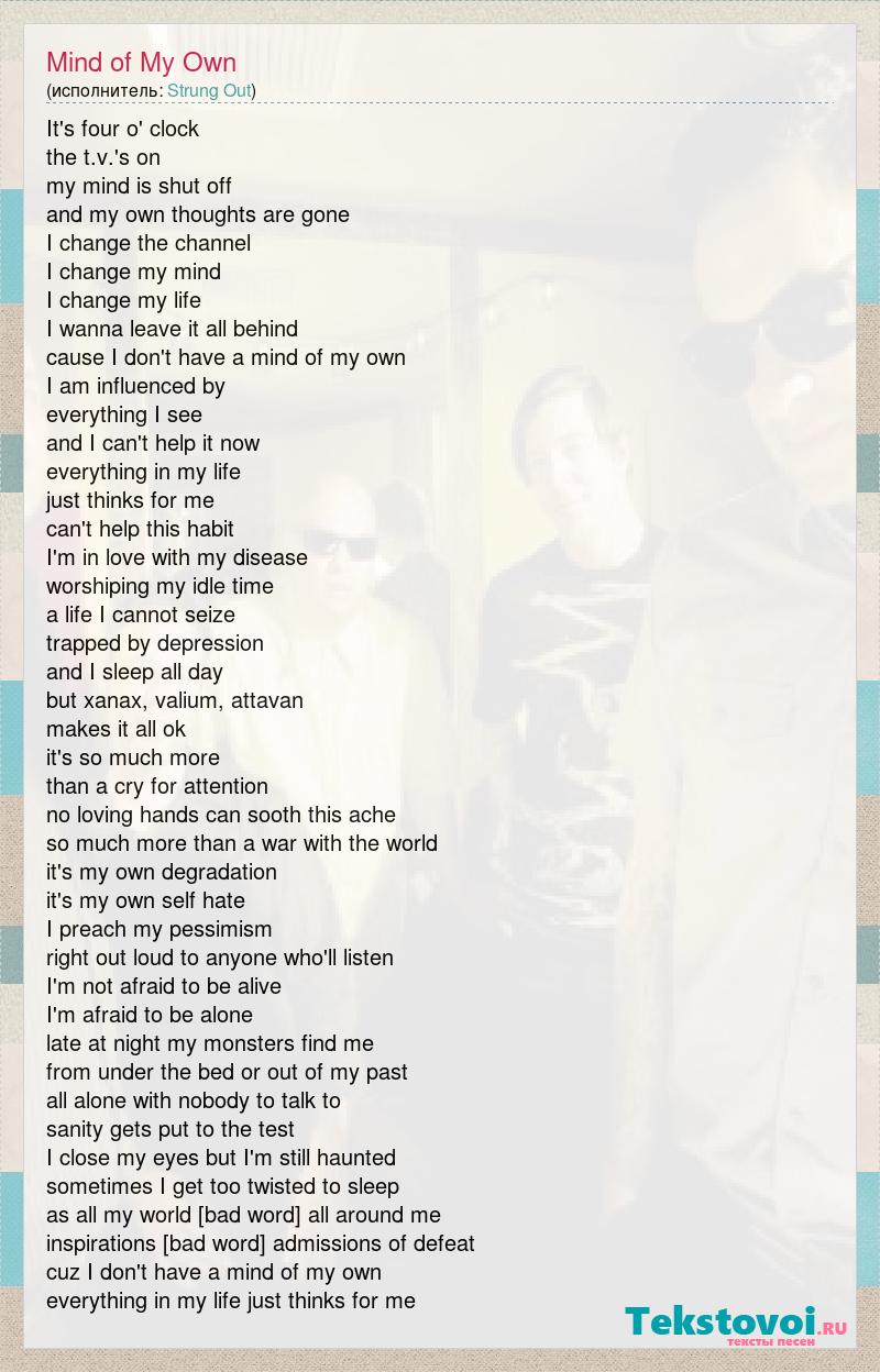 It's four o' clock the t.v.'s on my mind is shut off and my own thoughts are gone I change the channel I change my mind I change my life I wanna leave it all behind cause I don't have a mind of my own I am influenced by everything I see and I can't help it now everything in my life just thinks for me can't help this habit I'm in love with my disease worshiping my idle time a life I cannot seize trapped by depression and I sleep all day but xanax, valium, attavan makes it all ok it's so much more than a cry for attention no loving hands can sooth this ache so much more than a war with the world it's my own degradation it's my own self hate I preach my pessimism right out loud to anyone who'll listen I'm not afraid to be alive I'm afraid to be alone late at night my monsters find me from under the bed or out of my past all alone with nobody to talk to sanity gets put to the test I close my eyes but I'm still haunted sometimes I get too twisted to sleep as all my world [bad word] all around me inspirations [bad word] admissions of defeat cuz I don't have a mind of my own everything in my life just thinks for me