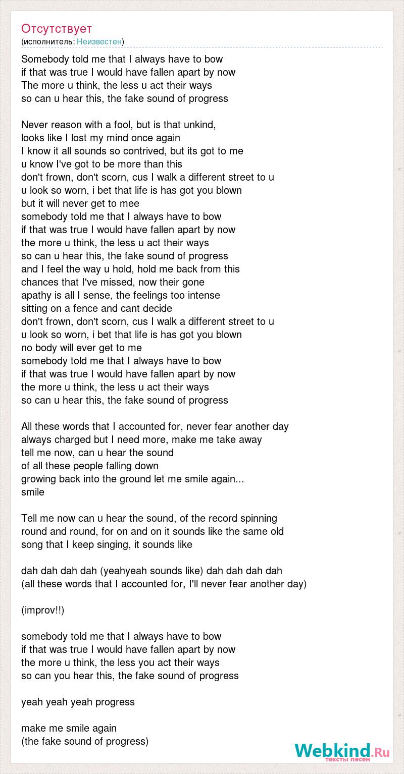 Somebody told me that I always have to bow if that was true I would have fallen apart by now The more u think, the less u act their ways so can u hear this, the fake sound of progress Never reason with a fool, but is that unkind, looks like I lost my mind once again I know it all sounds so contrived, but its got to me u know I've got to be more than this don't frown, don't scorn, cus I walk a different street to u u look so worn, i bet that life is has got you blown but it will never get to mee somebody told me that I always have to bow if that was true I would have fallen apart by now the more u think, the less u act their ways so can u hear this, the fake sound of progress and I feel the way u hold, hold me back from this chances that I've missed, now their gone apathy is all I sense, the feelings too intense sitting on a fence and cant decide don't frown, don't scorn, cus I walk a different street to u u look so worn, i bet that life is has got you blown no body will ever get to me somebody told me that I always have to bow if that was true I would have fallen apart by now the more u think, the less u act their ways so can u hear this, the fake sound of progress All these words that I accounted for, never fear another day always charged but I need more, make me take away tell me now, can u hear the sound of all these people falling down growing back into the ground let me smile again... smile Tell me now can u hear the sound, of the record spinning round and round, for on and on it sounds like the same old song that I keep singing, it sounds like dah dah dah dah (yeahyeah sounds like) dah dah dah dah (all these words that I accounted for, I'll never fear another day) (improv!!) somebody told me that I always have to bow if that was true I would have fallen apart by now the more u think, the less you act their ways so can you hear this, the fake sound of progress yeah yeah yeah progress make me smile again (the fake sound of progress)