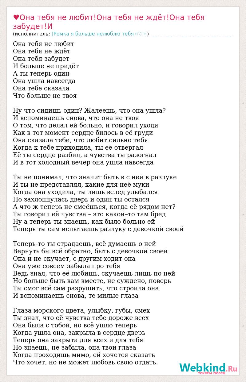 Она тебя не любит Она тебя не ждёт Она тебя забудет И больше не придёт А ты теперь один Она ушла навсегда Она тебе сказала Что больше не твоя Ну что сидишь один? Жалеешь, что она ушла? И вспоминаешь снова, что она не твоя О том, что делал ей больно, и говорил уходи Как в тот момент сердце билось в её груди Она сказала тебе, что любит сильно тебя Когда к тебе приходила, ты её отвергал Её ты сердце разбил, а чувства ты разогнал И в тот холодный вечер она ушла навсегда Ты не понимал, что значит быть в с ней в разлуке И ты не представлял, какие для неё муки Когда она уходила, ты лишь вслед улыбался Но захлопнулась дверь и один ты остался А что ж теперь не смеёшься, когда её рядом нет? Ты говорил её чувства – это какой–то там бред Ну а теперь ты знаешь, как было больно ей Теперь ты сам испытаешь разлуку с девочкой своей Теперь-то ты страдаешь, всё думаешь о ней Вернуть бы всё обратно, быть с девочкой своей Она и не скучает, с другим ходит она Она уже совсем забыла про тебя Ведь знал, что её любишь, скучаешь лишь по ней Но больше быть вам вместе, не суждено, поверь Ты смог всё сам разрушить, что строила она И вспоминаешь снова, те милые глаза Глаза морского цвета, улыбку, губы, смех Ты знал, что её чувства тебе дороже всех Она была с тобой, но всё ушло теперь Когда ушла она, закрыла в сердце дверь Теперь она закрыта для всех и для тебя Но знаешь, не забыла, она твои глаза Когда проходишь мимо, ей хочется сказать Что хочет, но не может любовь свою отдать.