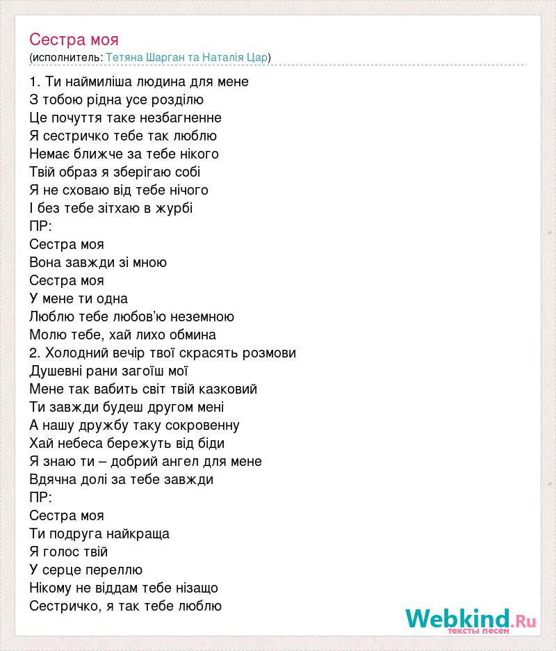 1. Ти наймиліша людина для мене З тобою рідна усе розділю Це почуття таке незбагненне Я сестричко тебе так люблю Немає ближче за тебе нікого Твій образ я зберігаю собі Я не сховаю від тебе нічого І без тебе зітхаю в журбі ПР: Сестра моя Вона завжди зі мною Сестра моя У мене ти одна Люблю тебе любов’ю неземною Молю тебе, хай лихо обмина 2. Холодний вечір твої скрасять розмови Душевні рани загоїш мої Мене так вабить світ твій казковий Ти завжди будеш другом мені А нашу дружбу таку сокровенну Хай небеса бережуть від біди Я знаю ти – добрий ангел для мене Вдячна долі за тебе завжди ПР: Сестра моя Ти подруга найкраща Я голос твій У серце переллю Нікому не віддам тебе нізащо Сестричко, я так тебе люблю