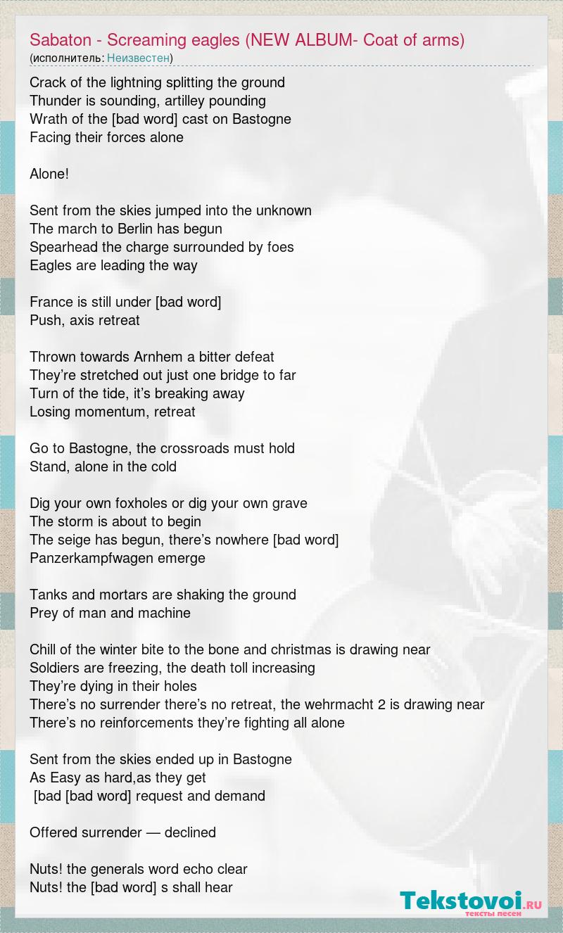 Crack of the lightning splitting the ground Thunder is sounding, artilley pounding Wrath of the [bad word] cast on Bastogne Facing their forces alone Alone! Sent from the skies jumped into the unknown The march to Berlin has begun Spearhead the charge surrounded by foes Eagles are leading the way France is still under [bad word] Push, axis retreat Thrown towards Arnhem a bitter defeat They’re stretched out just one bridge to far Turn of the tide, it’s breaking away Losing momentum, retreat Go to Bastogne, the crossroads must hold Stand, alone in the cold Dig your own foxholes or dig your own grave The storm is about to begin The seige has begun, there’s nowhere [bad word] Panzerkampfwagen emerge Tanks and mortars are shaking the ground Prey of man and machine Chill of the winter bite to the bone and christmas is drawing near Soldiers are freezing, the death toll increasing They’re dying in their holes There’s no surrender there’s no retreat, the wehrmacht 2 is drawing near There’s no reinforcements they’re fighting all alone Sent from the skies ended up in Bastogne As Easy as hard,as they get [bad [bad word] request and demand Offered surrender — declined Nuts! the generals word echo clear Nuts! the [bad word] s shall hear