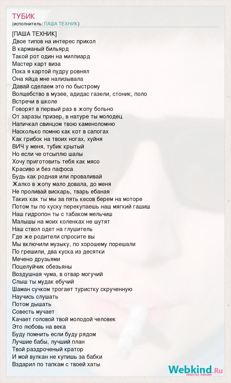 [ПАША ТЕХНИК] Двое типов на интерес прикол В карманый бильярд Такой рот один на миллиард Мастер карт виза Пока я картой пудру ровнял Она яйца мне нализывала Давай сделаем это по быстрому Волщебство в музее, адидас газели, стоник, поло Встречи в школе Говорят в первый раз в жопу больно От заразы призер, в натуре ты молодец Напичкал свинцом твою каменоломню Насколько помню как кот в сапогах Как грибок на твоих ногах, хуйня ВИЧ у меня, тубик крытый Но если че отсыплю шалы Хочу приготовить тебя как мясо Красиво и без пафоса Будь как родная или проваливай Жалко в жопу мало довала, до меня Не проливай вискарь, тварь ебаная Таких как ты мы за пять кесов берем на моторе Потом ты по куску перекупаешь наш мягкий гашиш Наш гидропон ты с табаком мельчиш Малышы на моих коленках не шутят Наш ствол одет на глушитель Где же родители спросите вы Мы включили музыку, по хорошему порешали По грешили, два куска из десятки Мечено друзьями Поцелуйчик обезьяны Воздушная чума, в отвар могучий Слыш ты мудак ебучий Шаман сучком трогает туристку скрученную Научись слушать Потом дышать Совесть мучает Качает головой твой молодой человек Это любовь на века Буду помнить если буду рядом Лучшие бабы, лучший план Твой раздроченый кратор И мой вулкан не купишь за бабки Вздарил по тапкам с твоей хаты