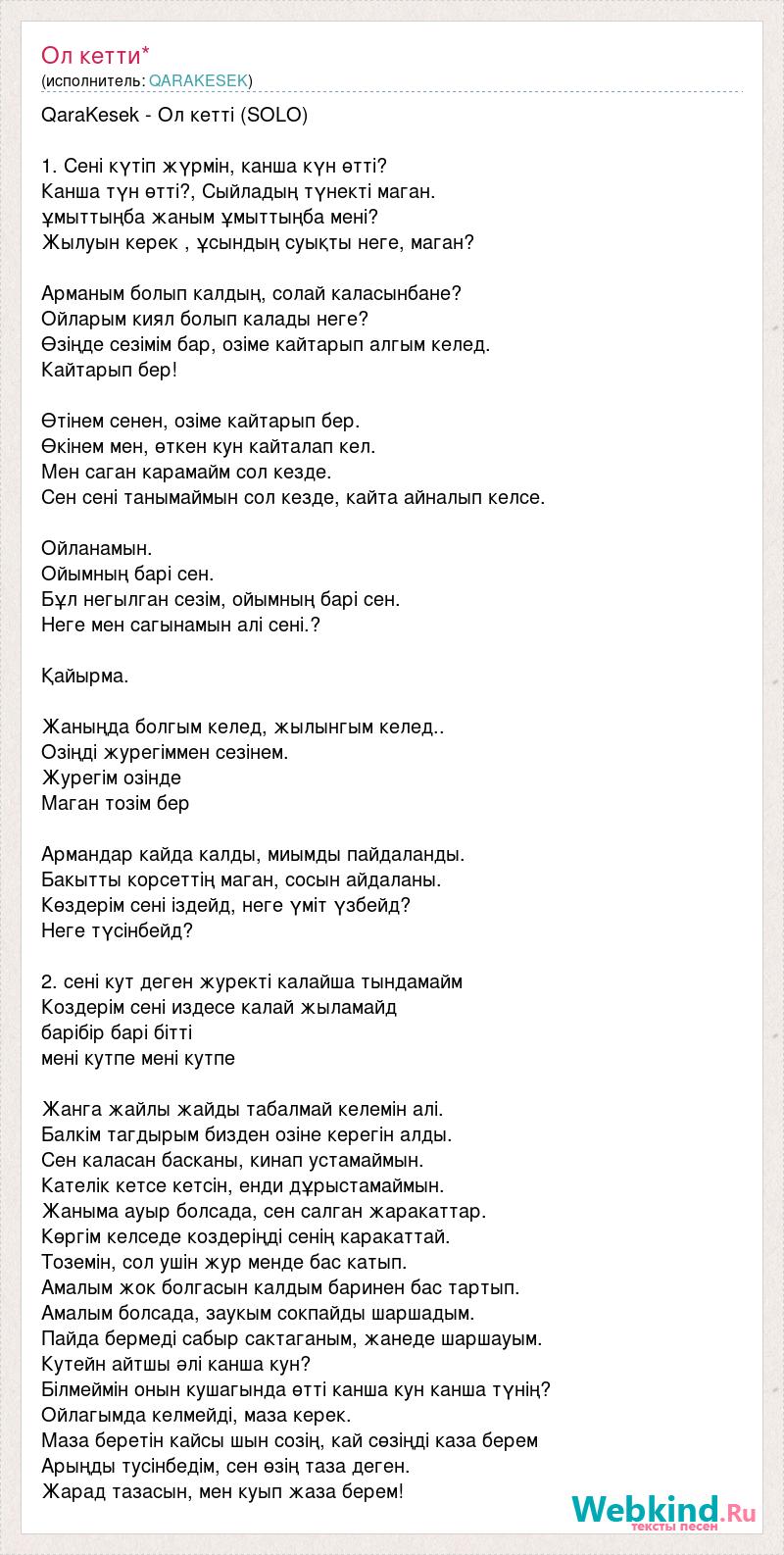 QaraKesek - Ол кеттi (SOLO) 1. Сені күтіп жүрмін, канша күн өтті? Канша түн өттi?, Сыйладың түнекті маган. ұмыттыңба жаным ұмыттыңба мені? Жылуын керек , ұсындың суықты неге, маган? Арманым болып калдың, солай каласынбане? Ойларым киял болып калады неге? Өзіңде сезімім бар, озіме кайтарып алгым келед. Кайтарып бер! Өтінем сенен, озіме кайтарып бер. Өкінем мен, өткен кун кайталап кел. Мен саган карамайм сол кезде. Сен сенi танымаймын сол кезде, кайта айналып келсе. Ойланамын. Ойымның барі сен. Бұл негылган сезім, ойымның барі сен. Неге мен сагынамын алі сені.? Қайырма. Жаныңда болгым келед, жылынгым келед.. Озіңді журегiммен сезiнем. Журегiм озiнде Маган тозiм бер Армандар кайда калды, миымды пайдаланды. Бакытты корсеттің маган, сосын айдаланы. Көздерім сені іздейд, неге үміт үзбейд? Неге түсінбейд? 2. сенi кут деген журектi калайшa тындамайм Коздерiм сенi издесе калай жыламайд барiбiр барi бiттi менi кутпе менi кутпе Жанга жайлы жайды табалмай келемін алі. Балкім тагдырым бизден озіне керегін алды. Сен каласан басканы, кинап устамаймын. Кателік кетсе кетсін, енди дұрыстамаймын. Жаныма ауыр болсада, сен салган жаракаттар. Көргім келседе коздеріңді сенің каракаттай. Тоземін, сол ушін жур менде бас катып. Амалым жок болгасын калдым баринен бас тартып. Амалым болсада, заукым сокпайды шаршадым. Пайда бермеді сабыр сактаганым, жанеде шаршауым. Кутейн айтшы әлі канша кун? Білмеймін онын кушагында өтті канша кун канша түнің? Ойлагымда келмейді, маза керек. Маза беретін кайсы шын созің, кай сөзіңді каза берeм Арыңды тусінбедім, сен өзің таза деген. Жарад тазасын, мен куып жаза берем!
