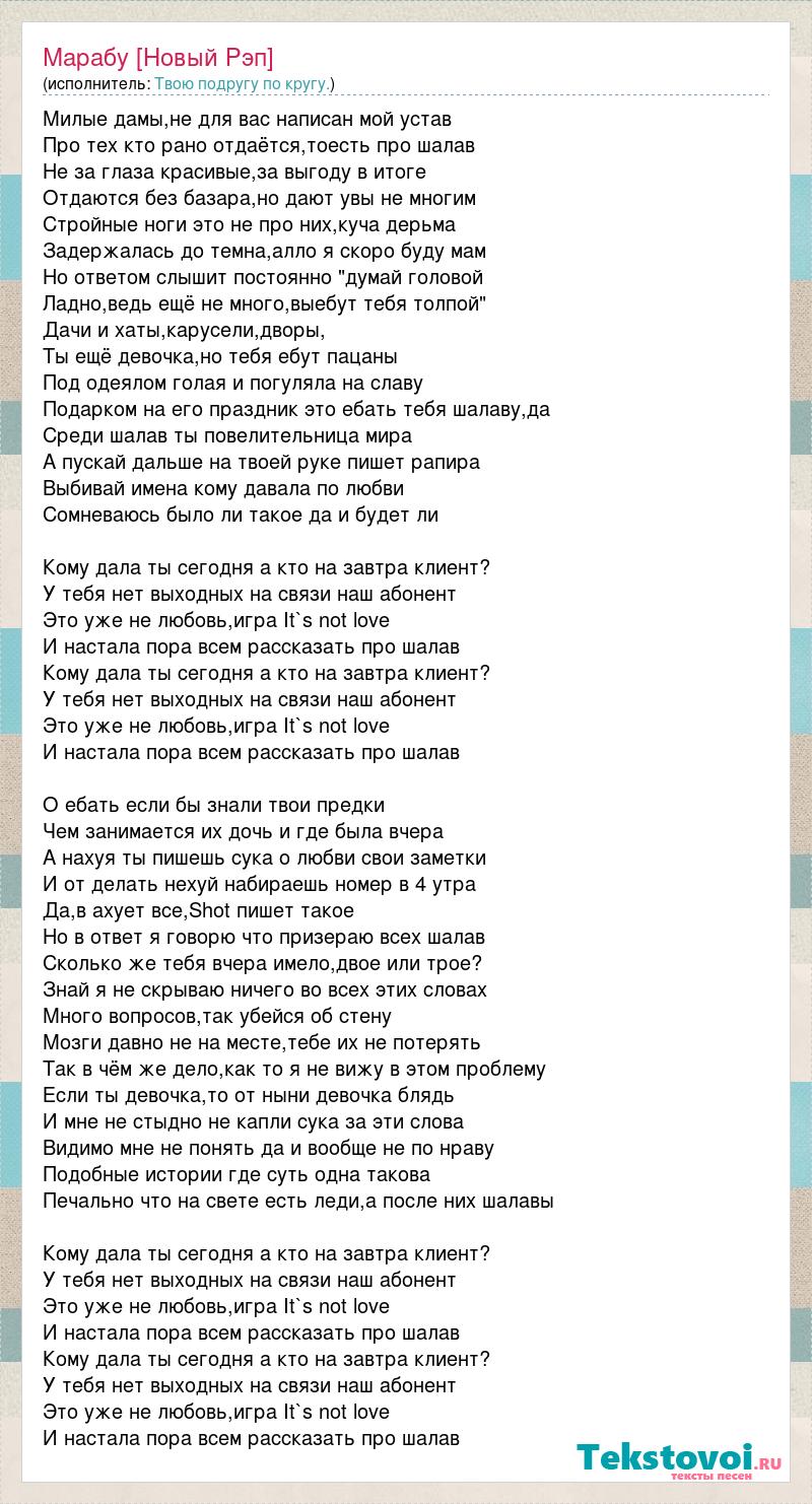 Милые дамы,не для вас написан мой устав Про тех кто рано отдаётся,тоесть про шалав Не за глаза красивые,за выгоду в итоге Отдаются без базара,но дают увы не многим Стройные ноги это не про них,куча дерьма Задержалась до темна,алло я скоро буду мам Но ответом слышит постоянно "думай головой Ладно,ведь ещё не много,выебут тебя толпой" Дачи и хаты,карусели,дворы, Ты ещё девочка,но тебя ебут пацаны Под одеялом голая и погуляла на славу Подарком на его праздник это ебать тебя шалаву,да Среди шалав ты повелительница мира А пускай дальше на твоей руке пишет рапира Выбивай имена кому давала по любви Сомневаюсь было ли такое да и будет ли Кому дала ты сегодня а кто на завтра клиент? У тебя нет выходных на связи наш абонент Это уже не любовь,игра It`s not love И настала пора всем рассказать про шалав Кому дала ты сегодня а кто на завтра клиент? У тебя нет выходных на связи наш абонент Это уже не любовь,игра It`s not love И настала пора всем рассказать про шалав О ебать если бы знали твои предки Чем занимается их дочь и где была вчера А нахуя ты пишешь сука о любви свои заметки И от делать нехуй набираешь номер в 4 утра Да,в ахует все,Shot пишет такое Но в ответ я говорю что призераю всех шалав Сколько же тебя вчера имело,двое или трое? Знай я не скрываю ничего во всех этих словах Много вопросов,так убейся об стену Мозги давно не на месте,тебе их не потерять Так в чём же дело,как то я не вижу в этом проблему Если ты девочка,то от ныни девочка блядь И мне не стыдно не капли сука за эти слова Видимо мне не понять да и вообще не по нраву Подобные истории где суть одна такова Печально что на свете есть леди,а после них шалавы Кому дала ты сегодня а кто на завтра клиент? У тебя нет выходных на связи наш абонент Это уже не любовь,игра It`s not love И настала пора всем рассказать про шалав Кому дала ты сегодня а кто на завтра клиент? У тебя нет выходных на связи наш абонент Это уже не любовь,игра It`s not love И настала пора всем рассказать про шалав